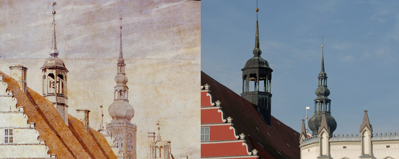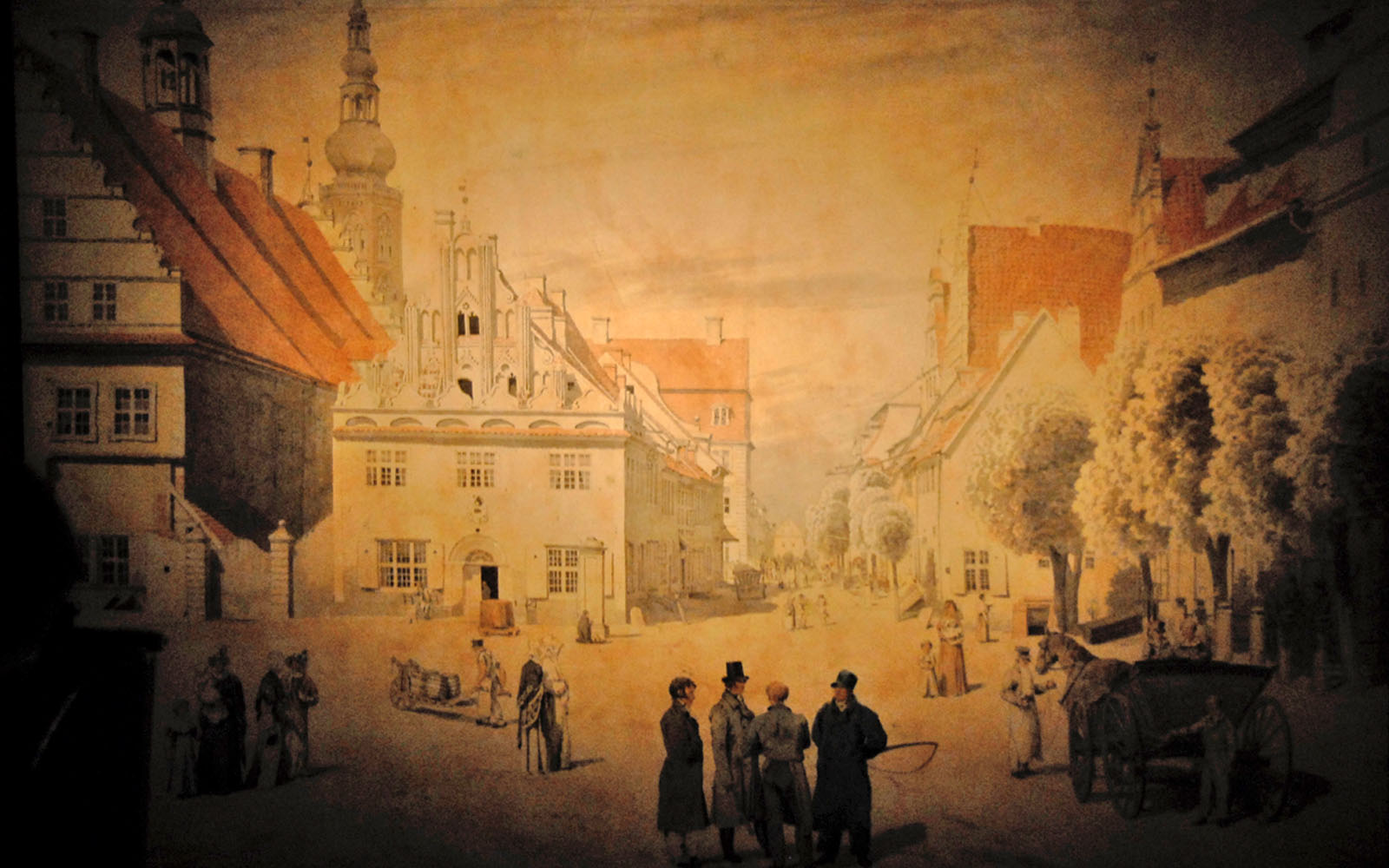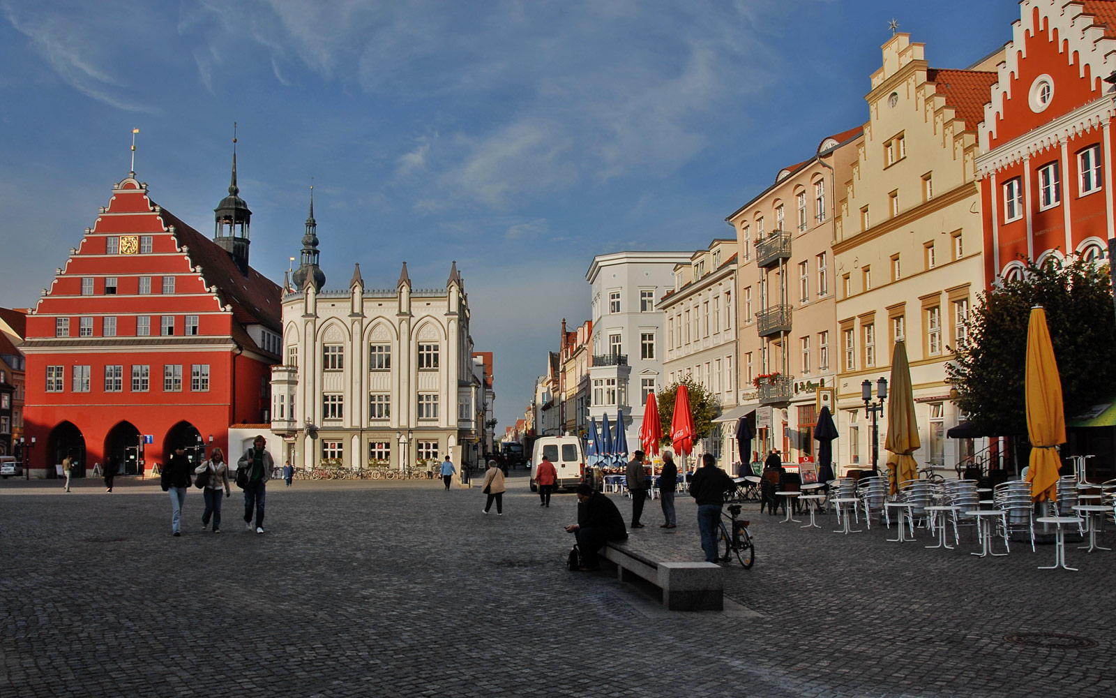 Der Marktplatz von Greifswald – vor 200 Jahren aus dem Pinsel von Caspar – und heute.