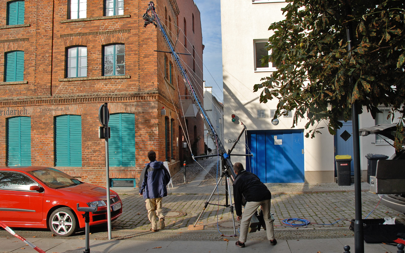 Kamerakran steht: Die Fahrt um das Geburtshaus kann beginnen!