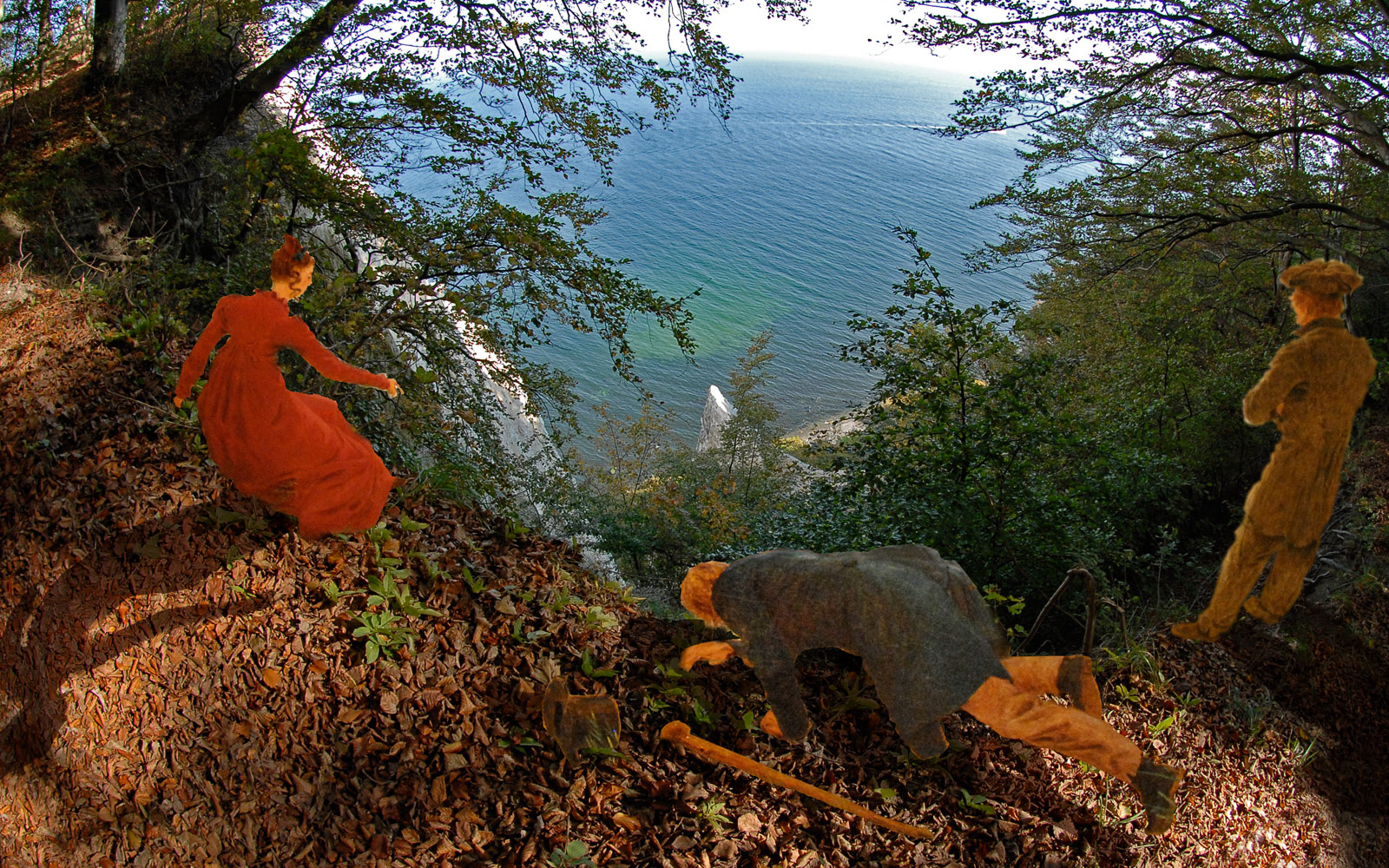 Eines der berühmtesten Gemälde von Caspar entstand auf der Ostsee-Insel Rügen. Drei Figuren am Abgrund der Kreideküste. Er selbst, seine Frau und sein Vater angstvoll am Boden kauernd. Eine Stunde lang mit Kunstexperten am Ohr suchen wir die Stelle, an der Caspar das Bild gemalt hat. Dann stehen wir an seinem Platz. Ein ziemlich unscheinbarer Ort. Keine Tafel, kein Hinweis – nur Bäume, Gestrüpp, Kreidefelsen und ein endloser Blick auf die Ostsee hinaus. Trotzdem packt uns der Standort in der ersten Sekunde. Als stehst Du in einem lebenden Gemälde…