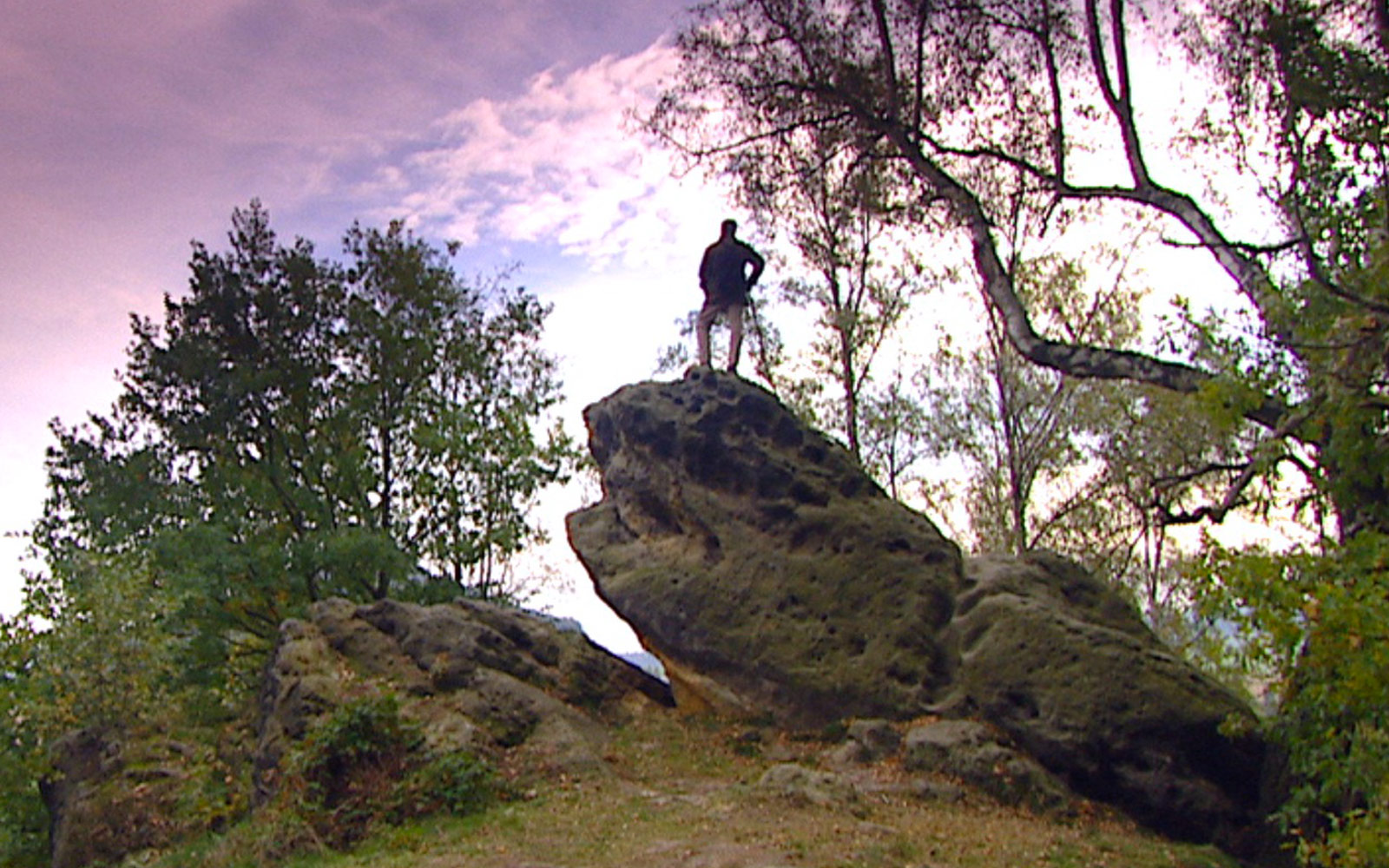 Der Caspar-Experte zögert nicht lange, zerrt einen langen Stock aus dem Unterholz und beginnt zu klettern. Gut überlegt nimmt er die ausgetretenen Stufen des Gipfels, bis er oben steht. Das linke Bein leicht angewinkelt nach vorne. Der Stock rechts in die Hüfte gestemmt. Den Kopf erhaben und erhoben. Du stehst wortlos unten und versuchst zu begreifen. Keine Chance. Da oben thront ein Wanderer über dem Nebelmeer. Fels, Pose, Bild im Kopf. Die Welt steht seit wenigen Minuten still.