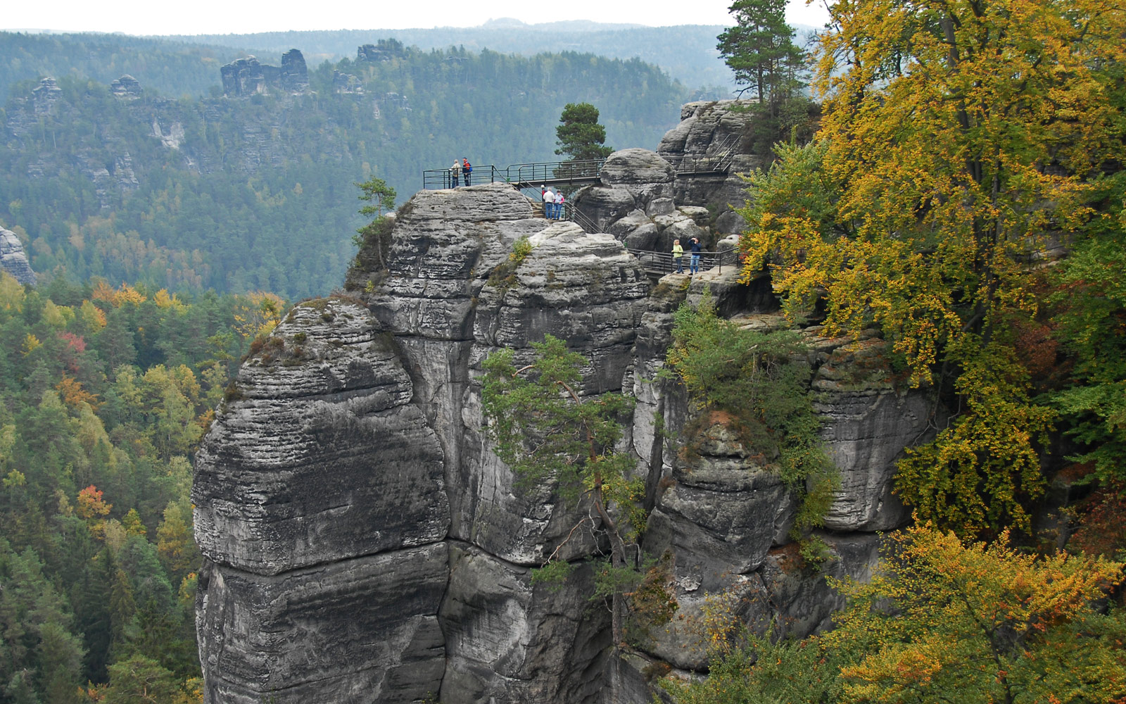 Frank Richter lotst uns auf die Bastei zu, als ginge es an einen Würstchen-Stand. Hier, noch ein Stück weiter, so, jetzt links runter. Ahnungslos stolpern wir zwischen tausenden von Touristen voran wie Treibholz im trägen Fluss. Was wollen all die Menschen hier? Eine Massenwanderung an einem normalen Werktag! Die zurückkommen, blicken Dich verklärt an. Die mitgehen, schnattern noch über dies und das. Da vorne um die Ecke muss etwas mit all den Menschen passieren, was Worte nicht ausdrücken können. Und tatsächlich. Oh mein Gott.