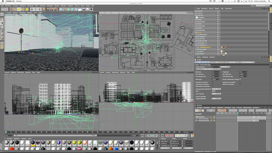 3D! Mit dem 3D-Programm Cinema 4D entsteht die Stadt nach und nach - mit vielen künstlichen Kameras und Gebäuden.