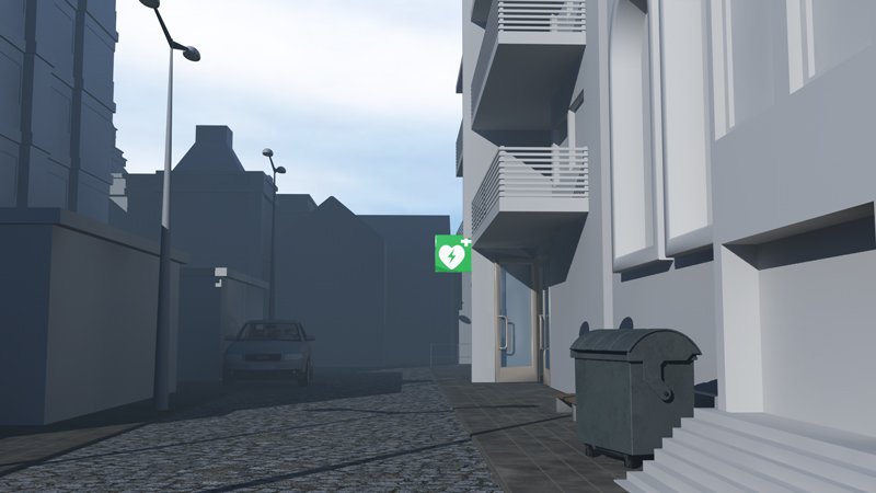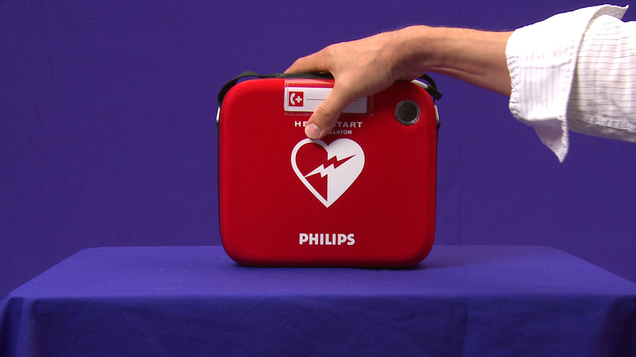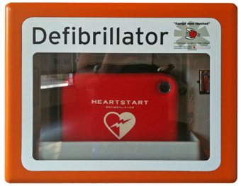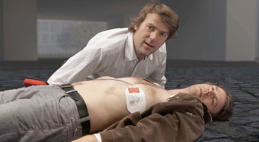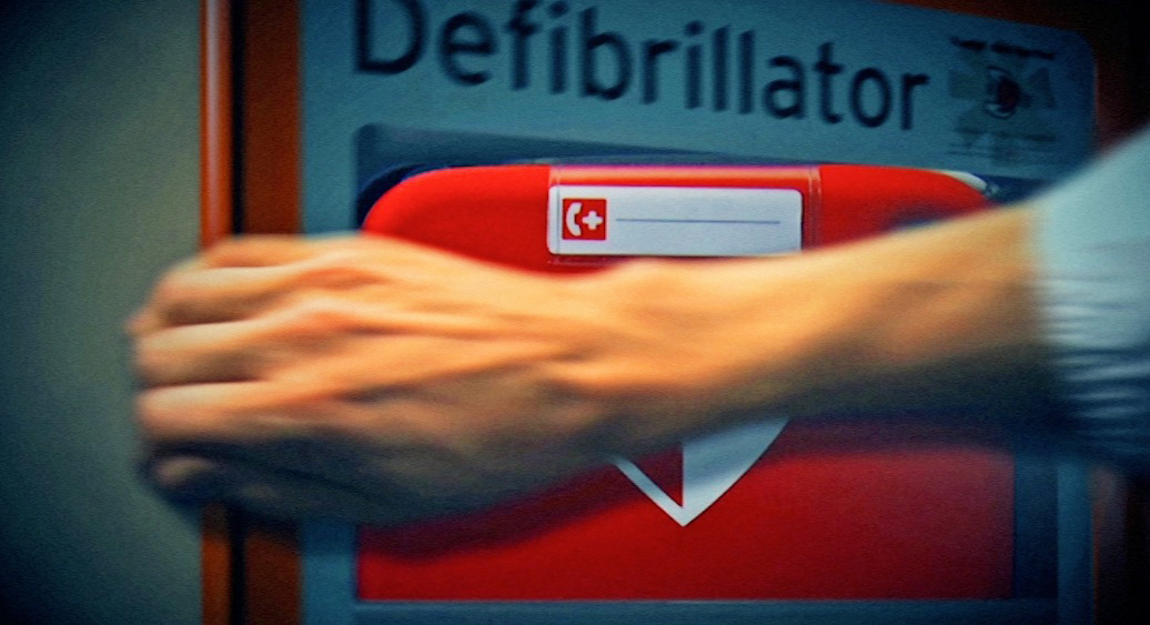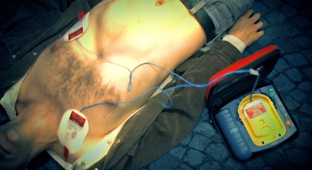 Defi. Wir nehmen das Zupacken beim Defi auf. Später soll das so aussehen, als nähme der Helfer das Gerät aus einem Kasten heraus.