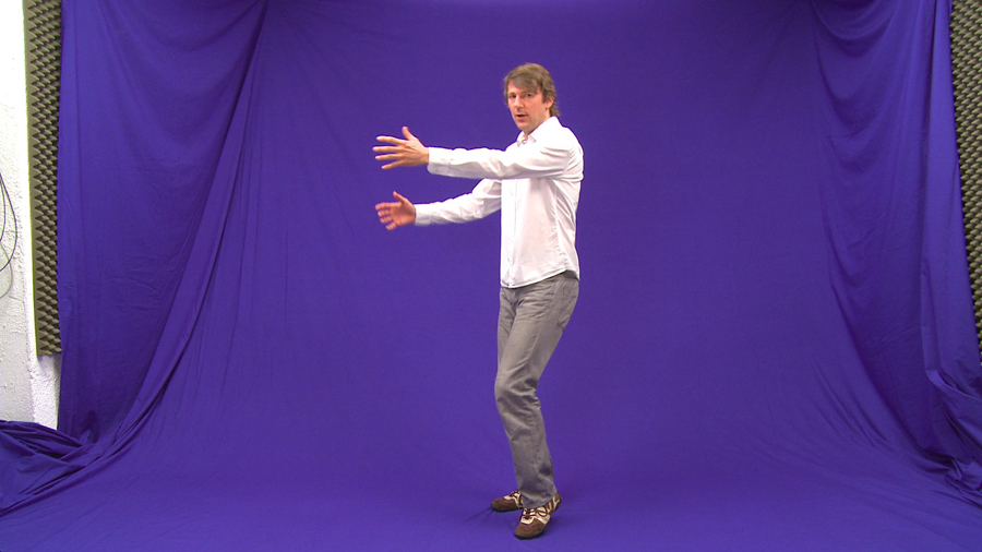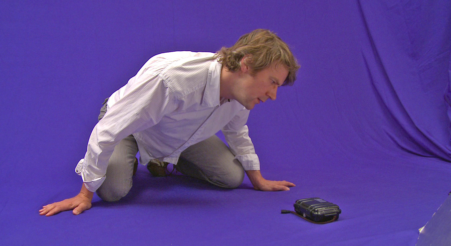 Einpegeln. Schauspieler müssen in der blauen Umgebung viel Phantasie mitbringen. Denn alle Requisiten und Situationen kommen erst später per Computer dazu.