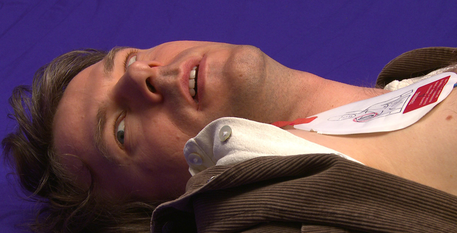 Hilfsmittel. Unser Mann spielt eine Doppelrolle – Helfer und Opfer zugleich. Denn die Botschaft des Filmes lautet ja auch: „Es kann jeden treffen – auch Dich“. Für uns heißt das: Wir müssen ihn zweimal aufnehmen. Der Helfer blickt auf ein kleines Hilfsmittel am Boden, wo später ungefähr der Kopf des Patienten liegen wird…