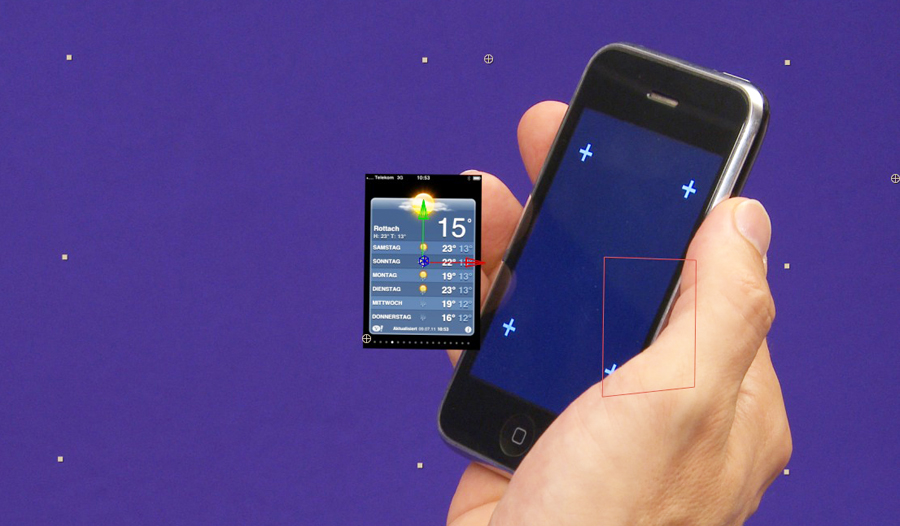 Handy simulieren: Bei der Aufnahme zeigt das Handy nur vier kleine Kreuze. Sie dienen später am Rechner zur Montage des künstlichen Screens auf das bewegte Telefon.