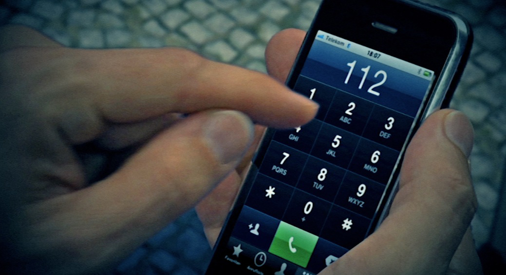 Endbild. Und das sieht dann so aus: Der Finger tippt die 112 auf dem Smartphone ein.