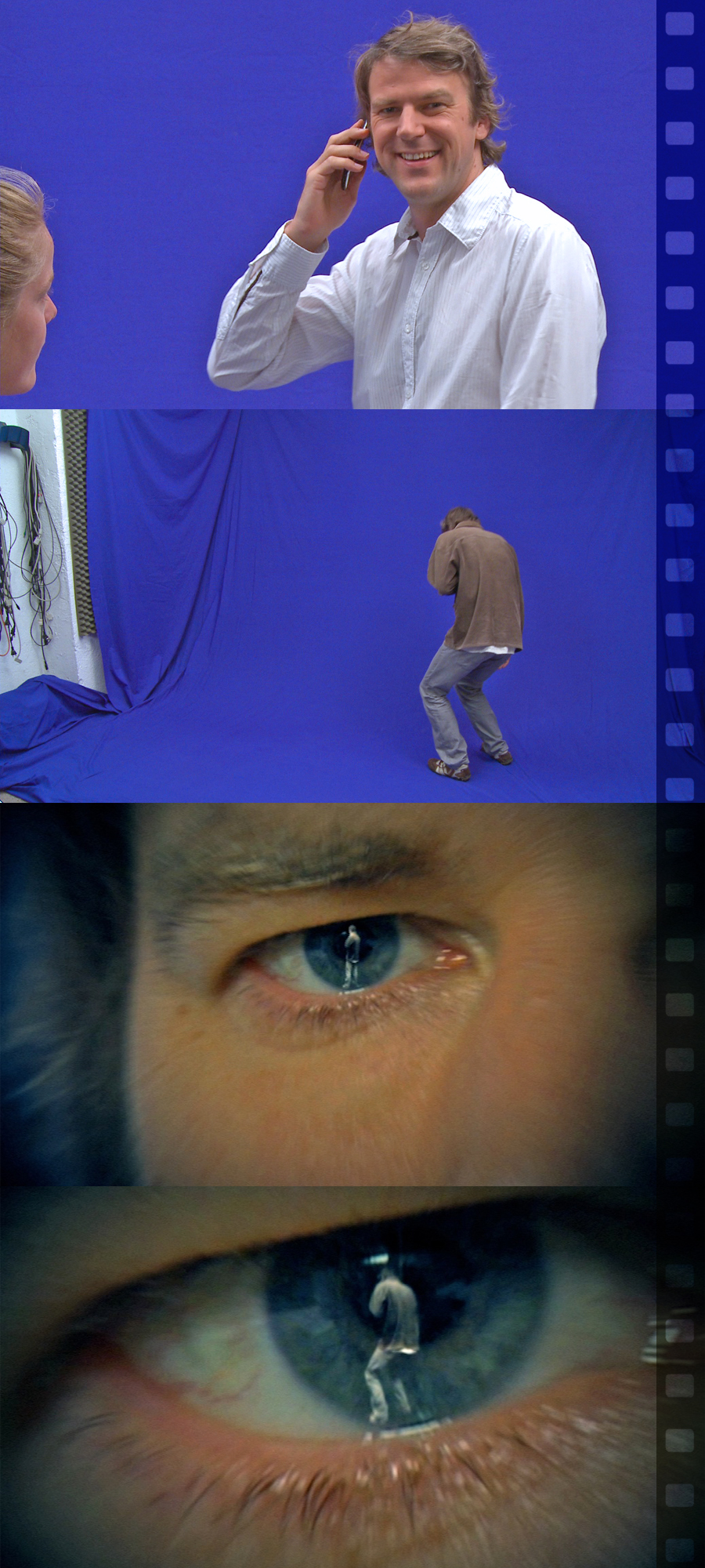 Schlüsselszene. Die Kamera fährt langsam auf den telefonierenden Darsteller zu… Und schon passiert es vor laufender Kamera. Alexander bricht „vorbildlich“ zusammen. Der Zusammenbruch soll sich später im Film in der Pupille des Schauspielers ereignen und das klappt auch ganz gut! Allerdings müssen wir ein pixelgenaues Tracking machen, weil sich die Pupille und das Bild natürlich bewegt – und die Spiegelung sich mitbewegen muss.