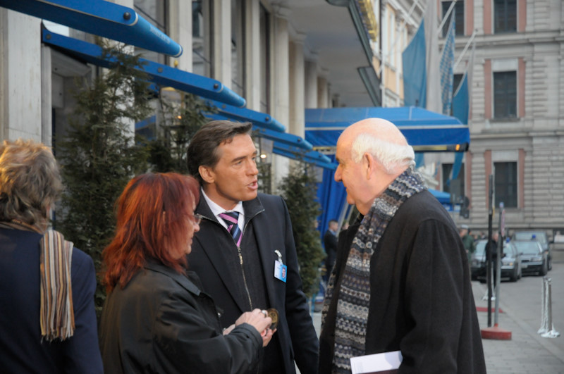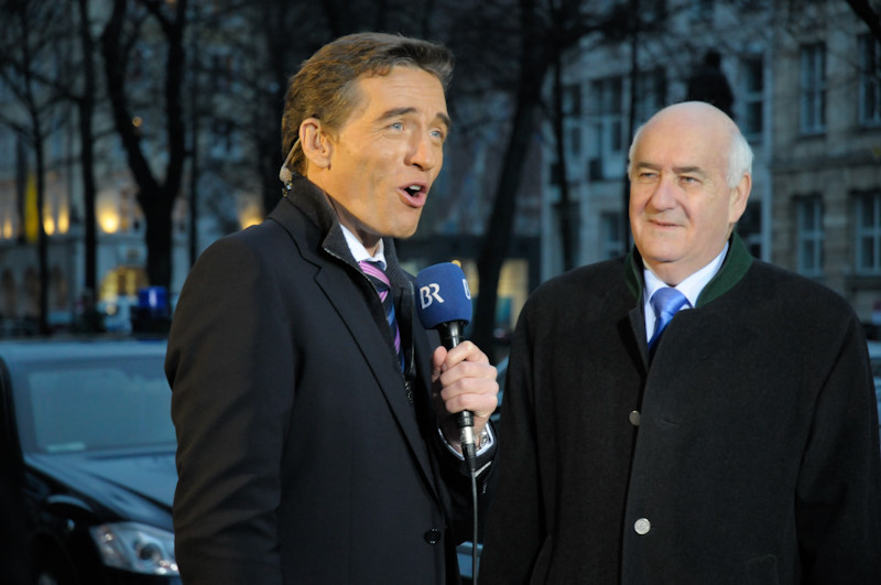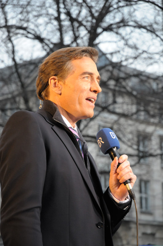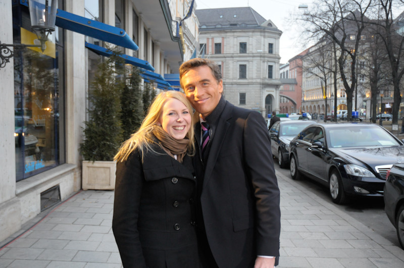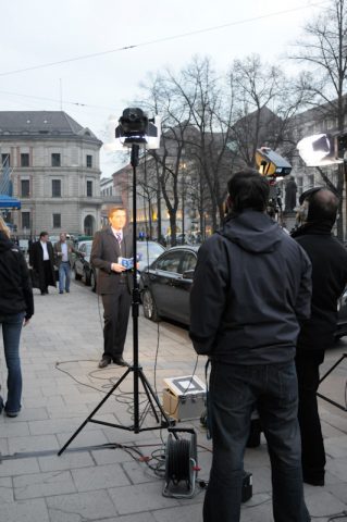 Es geht los. Das Live-Team zieht auf den Bürgersteig vor dem Hotel – und fährt dort die Sendung. Eine ziemlich frische Angelegenheit – im Februar in München…
