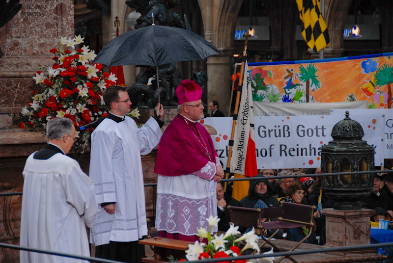 Auftritt: Gut erkennbar durch die leuchtenden Farben - der neue Erzbischof betritt das Podest auf dem Marienplatz.