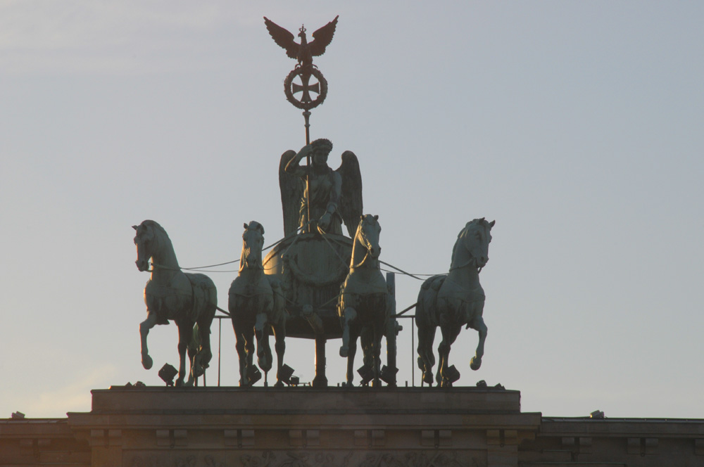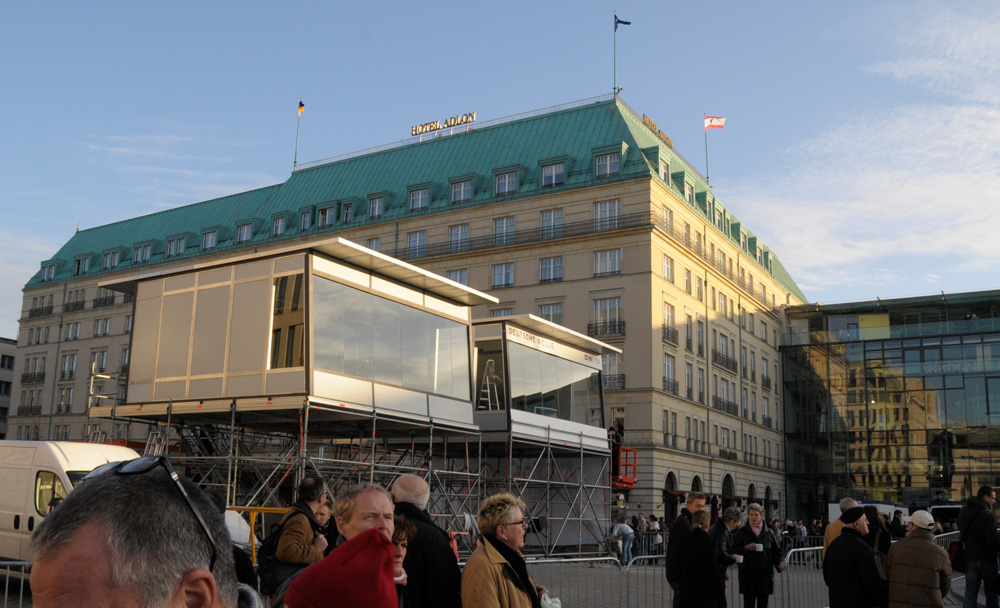 Unser Studio am Brandenburger Tor! Wir schlagen unser Sendungs-Lager direkt vor dem bekanntesten Wahrzeichen Deutschlands auf – dem Brandenburger Tor. Alles tummelt sich hier – ZDF, Deutsche Welle, ARD und zig Übertragungswägen…