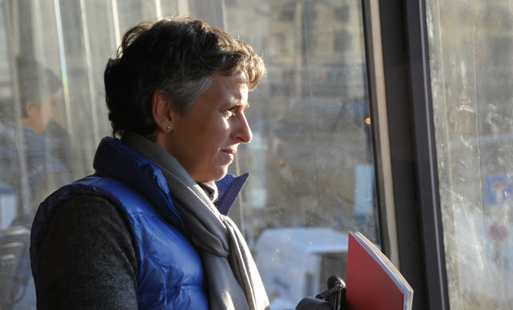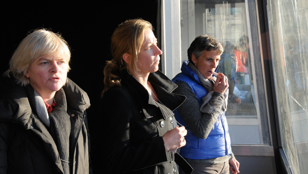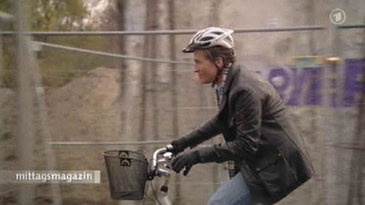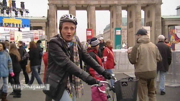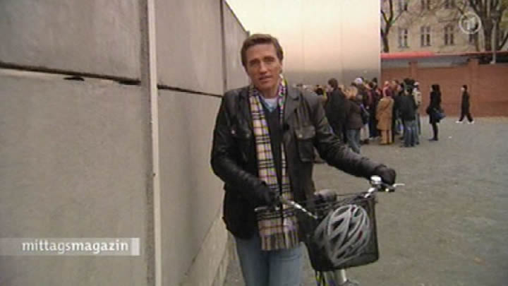 Scheider bekommt ein Damenrad und einen Kinderhelm – und soll die Stationen der Mauer abfahren. Und das Ganze am 9. November – sprich bei rund 3 Grad Celsius. Keine leichte Aufgabe, hier auch noch Geschichtsdaten frei heraus zu sprechen und dabei nicht vom Rad zu fallen. Aber am Ende kommt ein ziemlich lebendiger und informativer Filmbeitrag heraus…