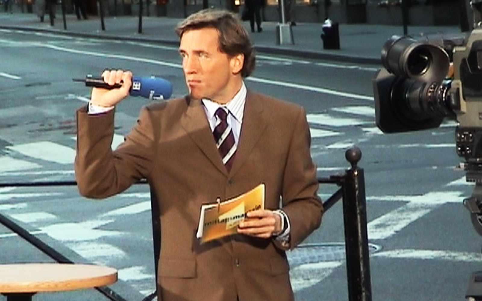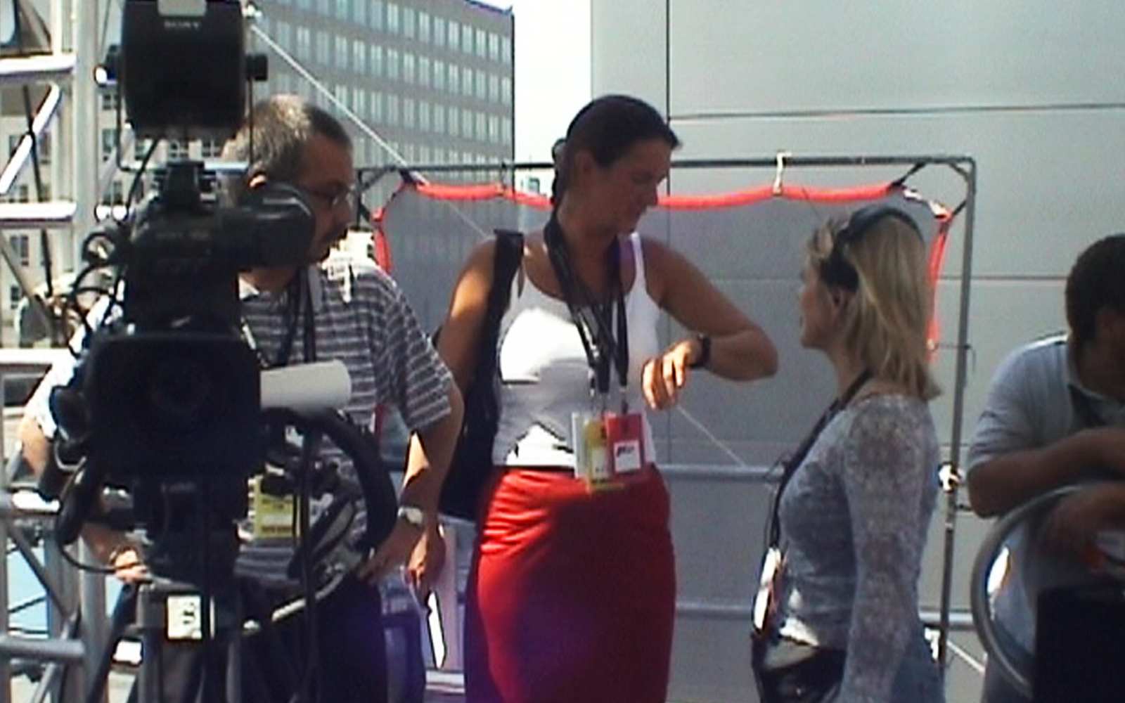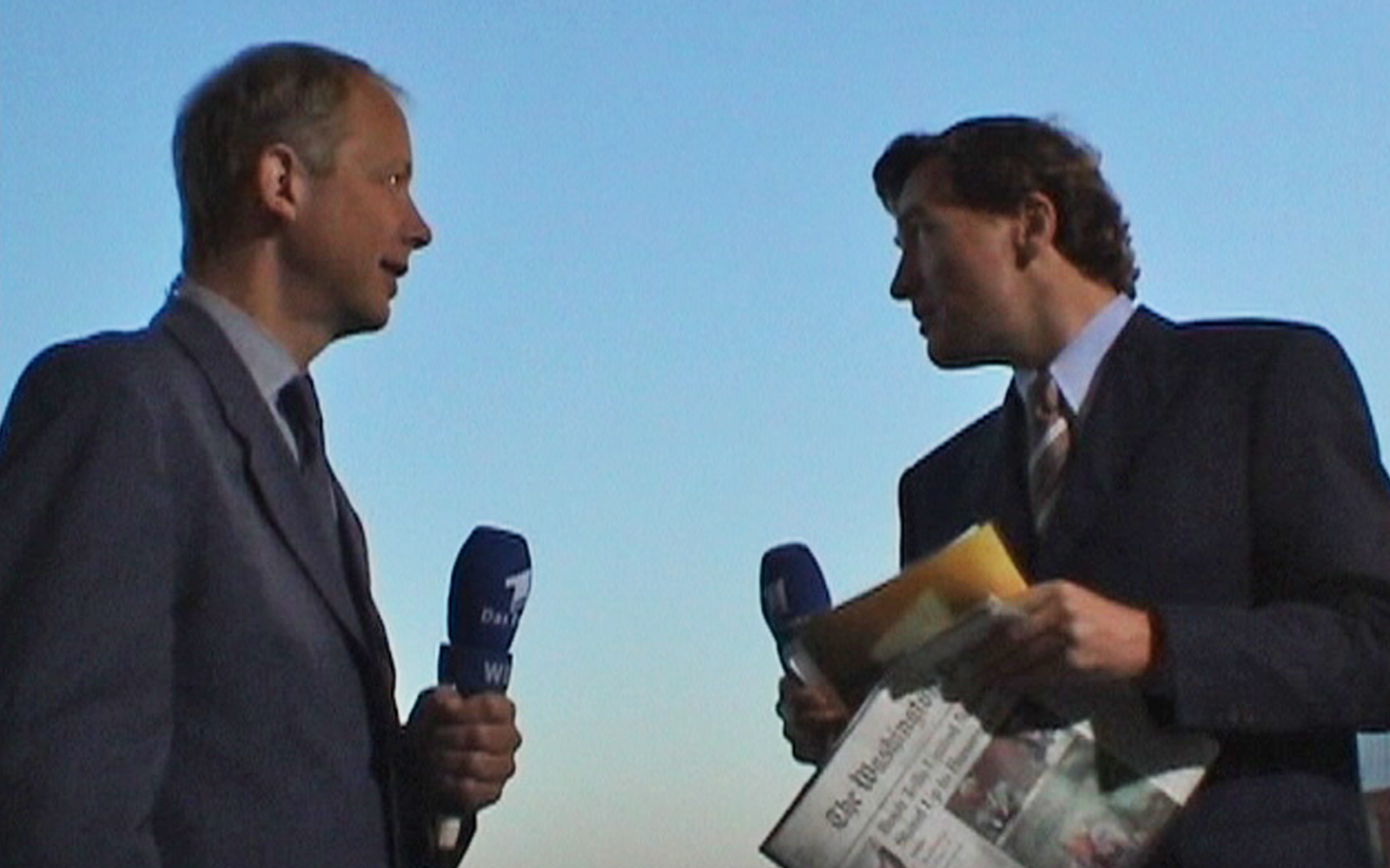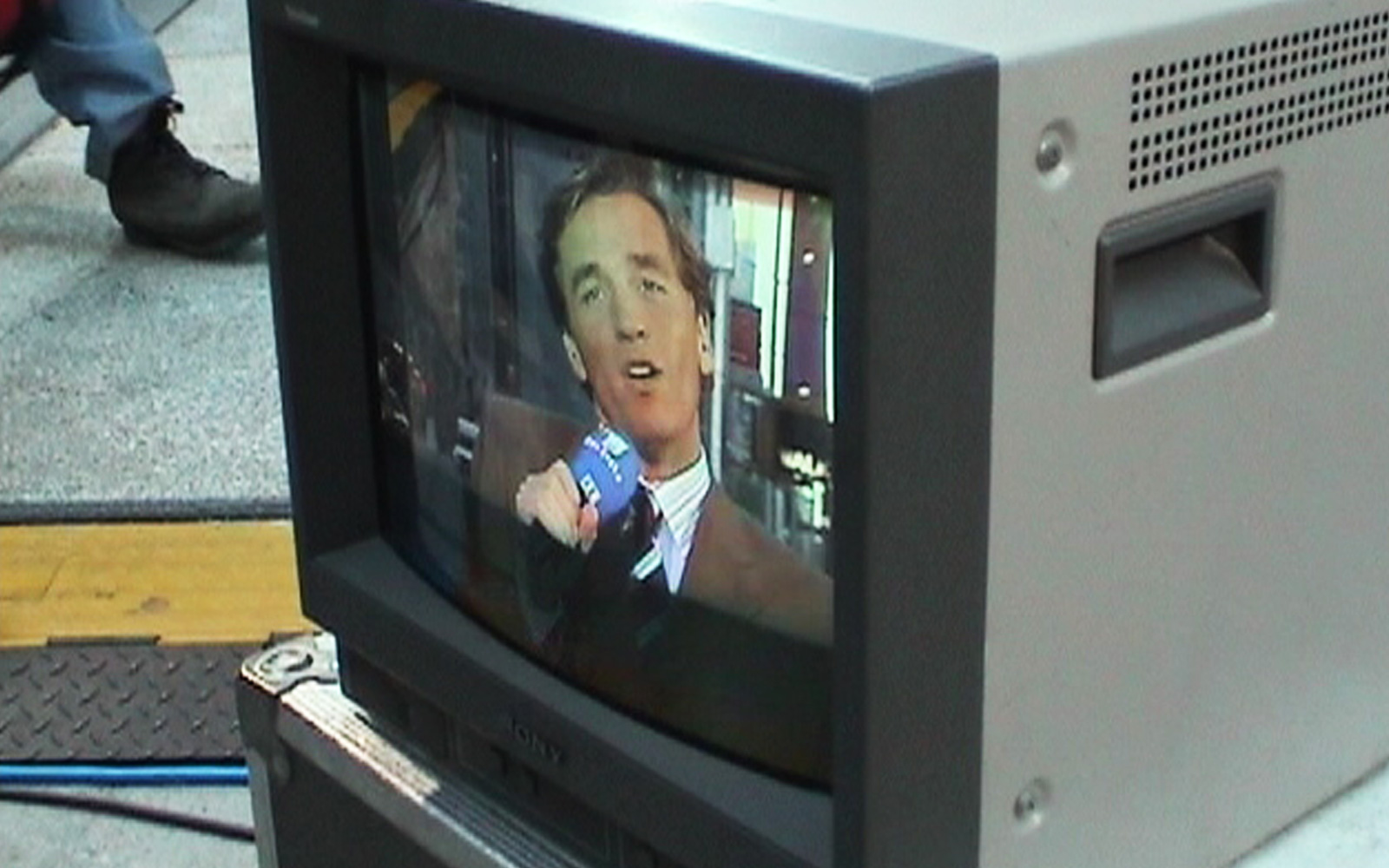 event_logos_911_v2Das Mittagsmagazin-Team bezieht sein „Studio“ auf einem Hoteldach – zusammen mit mehreren Dutzend anderen TV-Einheiten. Wir blicken direkt auf den Ground Zero und erleben mit, wie kurz vor 9 Uhr morgens ein Verkehrsflugzeug über den Ground Zero hinwegrauscht. Sicher ein Zufall. Aber trotzdem schauen alle hoch.