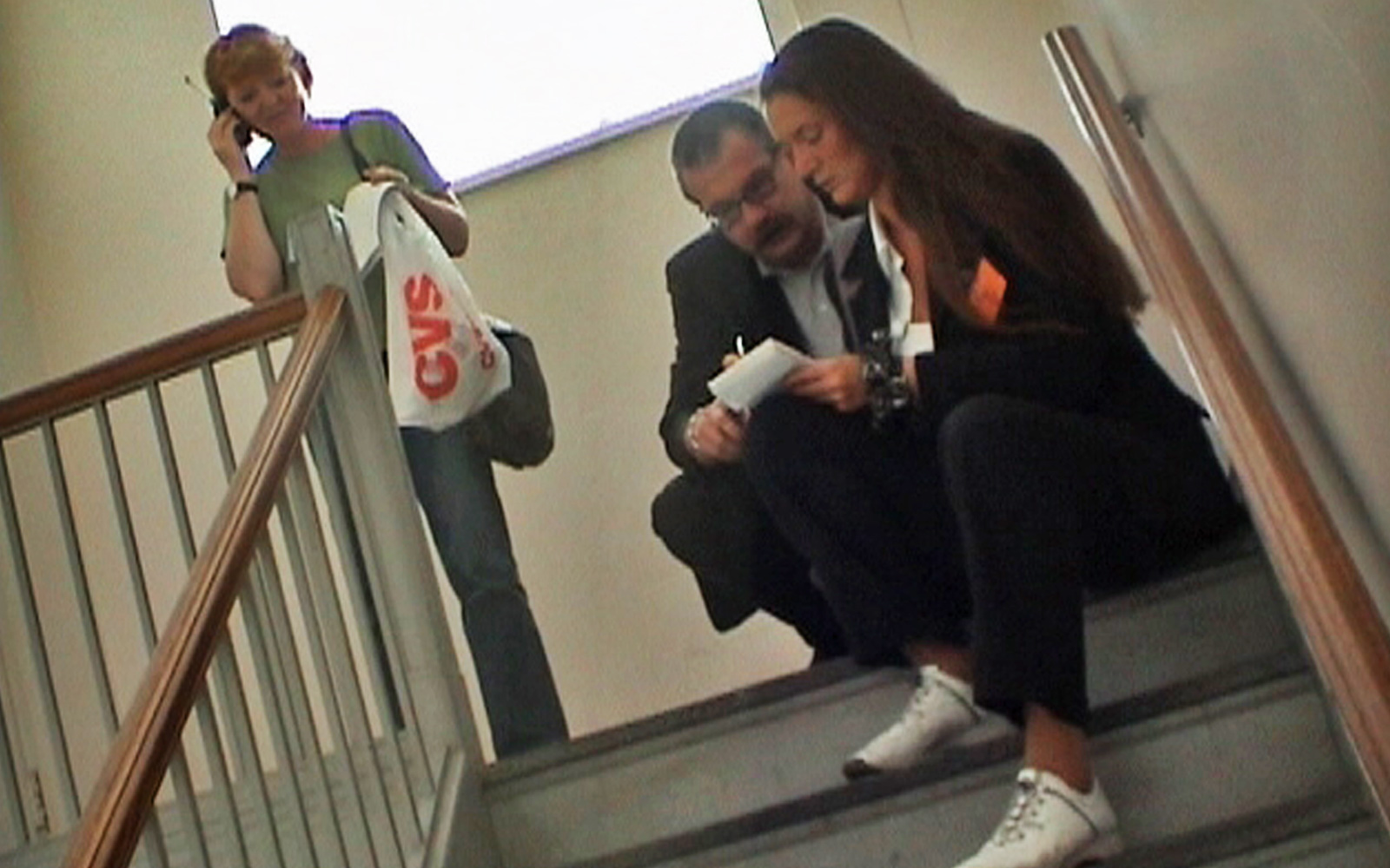 Im Treppenhaus der Handelskammer skizzieren Thomas und Carmen den Plan für morgen früh.