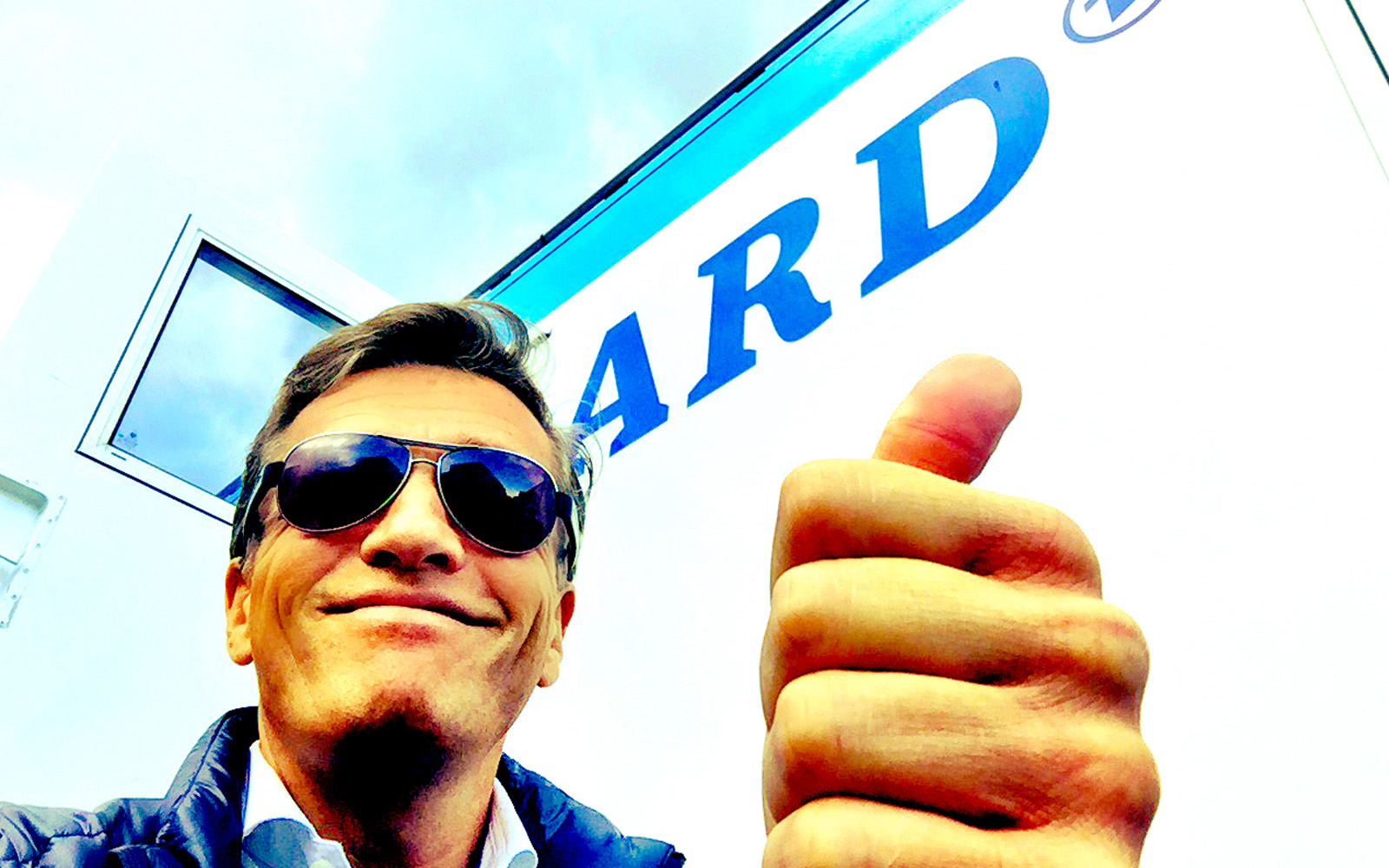 Scheider vor dem Ü-Wagen der ARD: Kann losgehen, oder?
