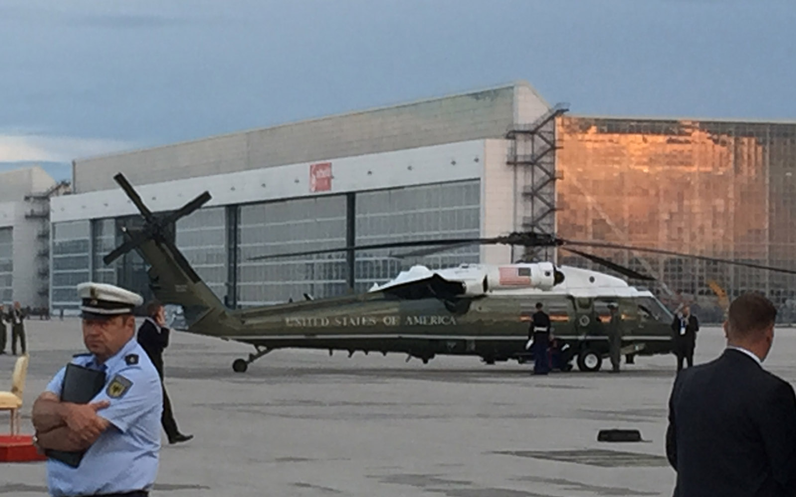 Der US-Präsident hat sogar seine eigenen berühmten Geräte mitgebracht – die dunkelgrüne „Marine One“ von Sikorsky!