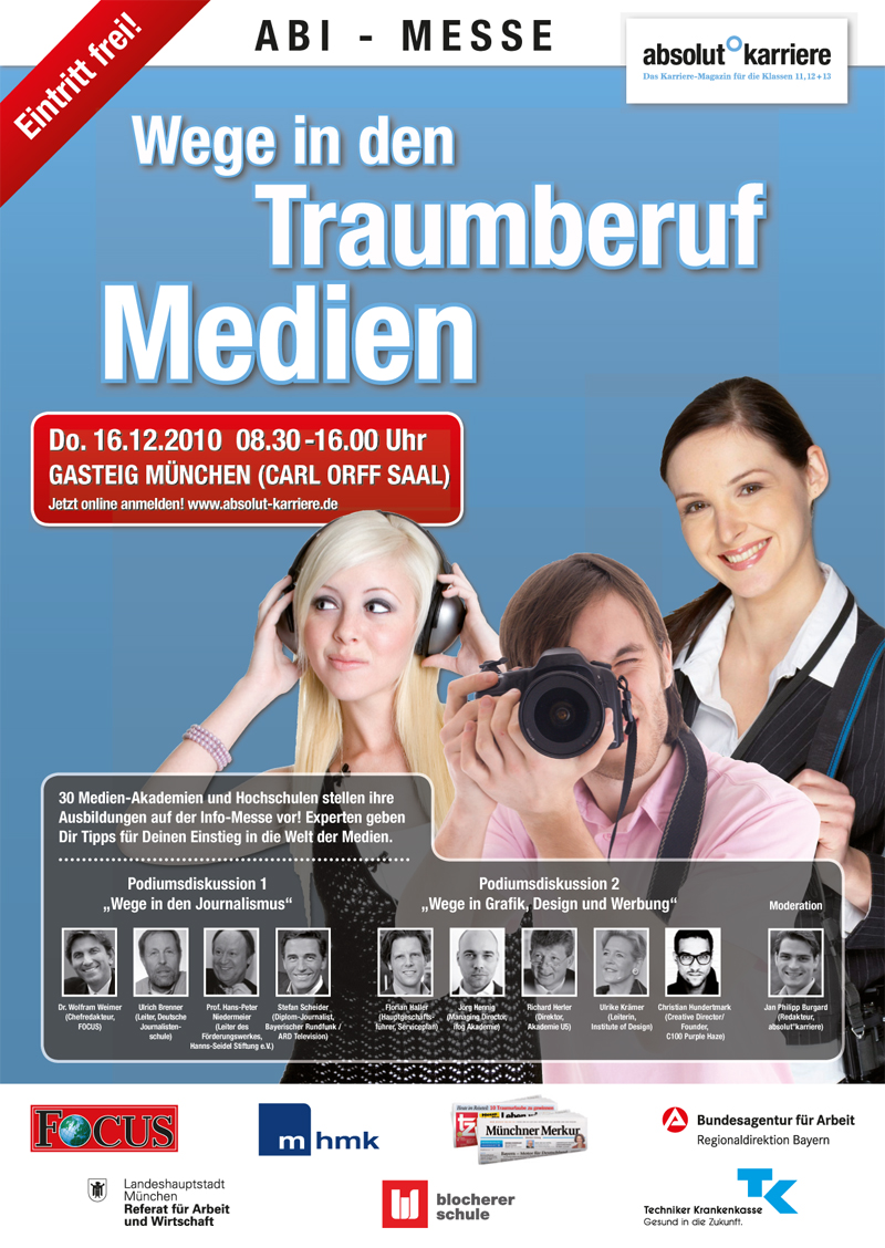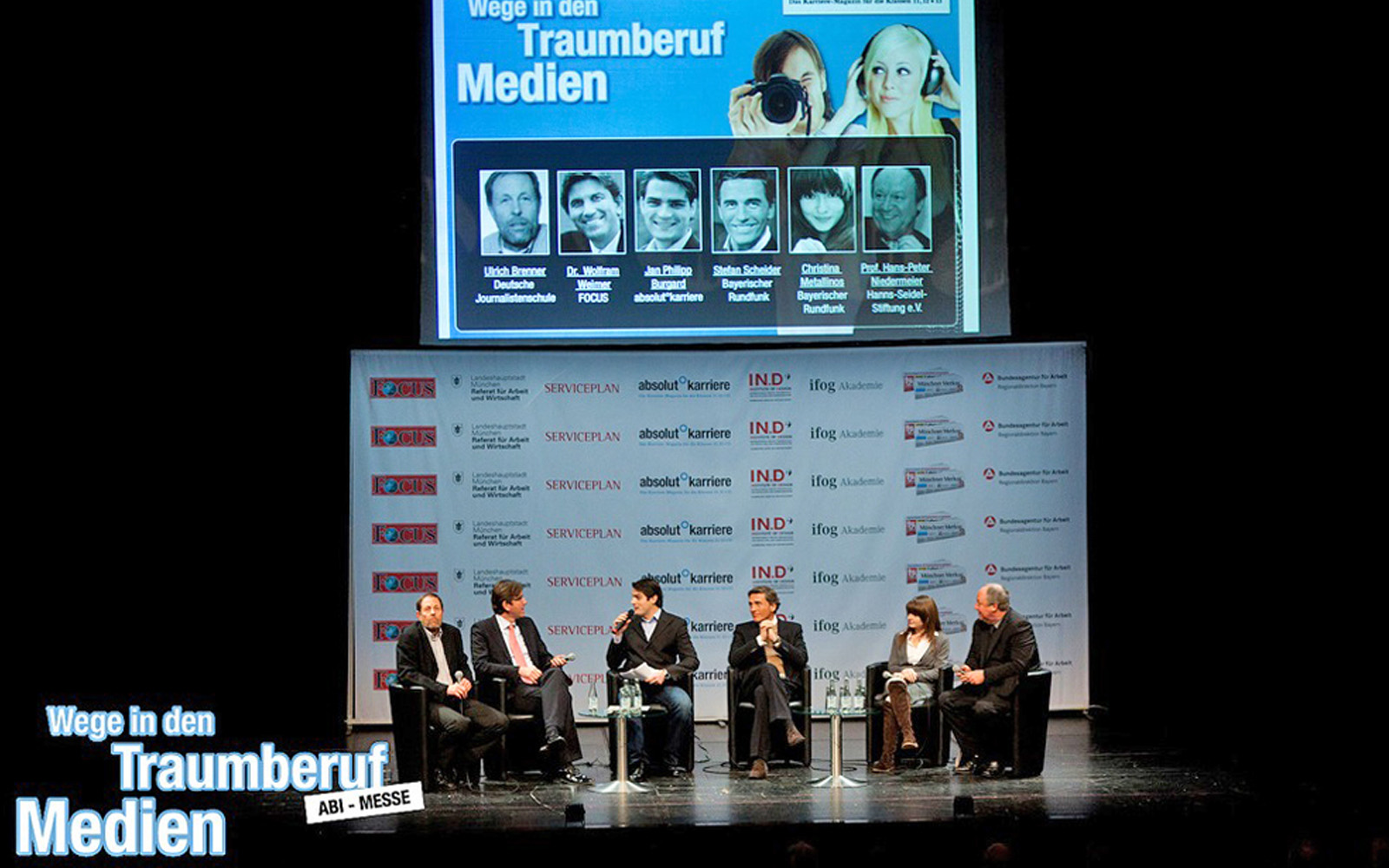 Donnerstag, 16. Dezember 2010. Der Carl-Orff-Saal am Münchner Gasteig füllt sich schnell am Tag der Abi-Messe von „absolut karriere“. Und das heißt was: Über eintausend Schülerinnen und Schüler drängen in den Saal und wollen wissen, welcher Weg am besten in die Berufswelt der Medien führt. Auf der Bühne sitzen erfahrene Leute – zum Beispiel FOCUS-Chefredakteur Wolfram Weimer oder DJS-Leiter Uli Brenner. Es moderiert Jan Philipp Burgard. Auch in den folgenden Jahren findet die Karrieremesse immer wieder statt – und immer mit auf dem Podium dabei: Scheider!