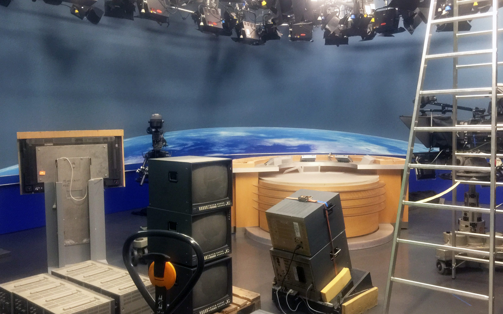 Viele Schrammen, Dellen, Pickel und Schleifspuren hat das alte Studio in all den Jahren zusammengetragen. Und dann schon einen Tag nach der Premiere der neuen Rundschau rücken die Sägen und Hämmer an. Die ganze Erdkugel verschwindet im Containermüll – und Scheider verlost noch rechtzeitig ein Stück Rundschau-Erde auf Facebook! Jetzt gibt es auch kein Zurück mehr. Eine Ära endet. Aber eine neue beginnt auch. Aufregende Zeiten.
