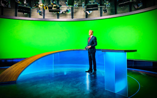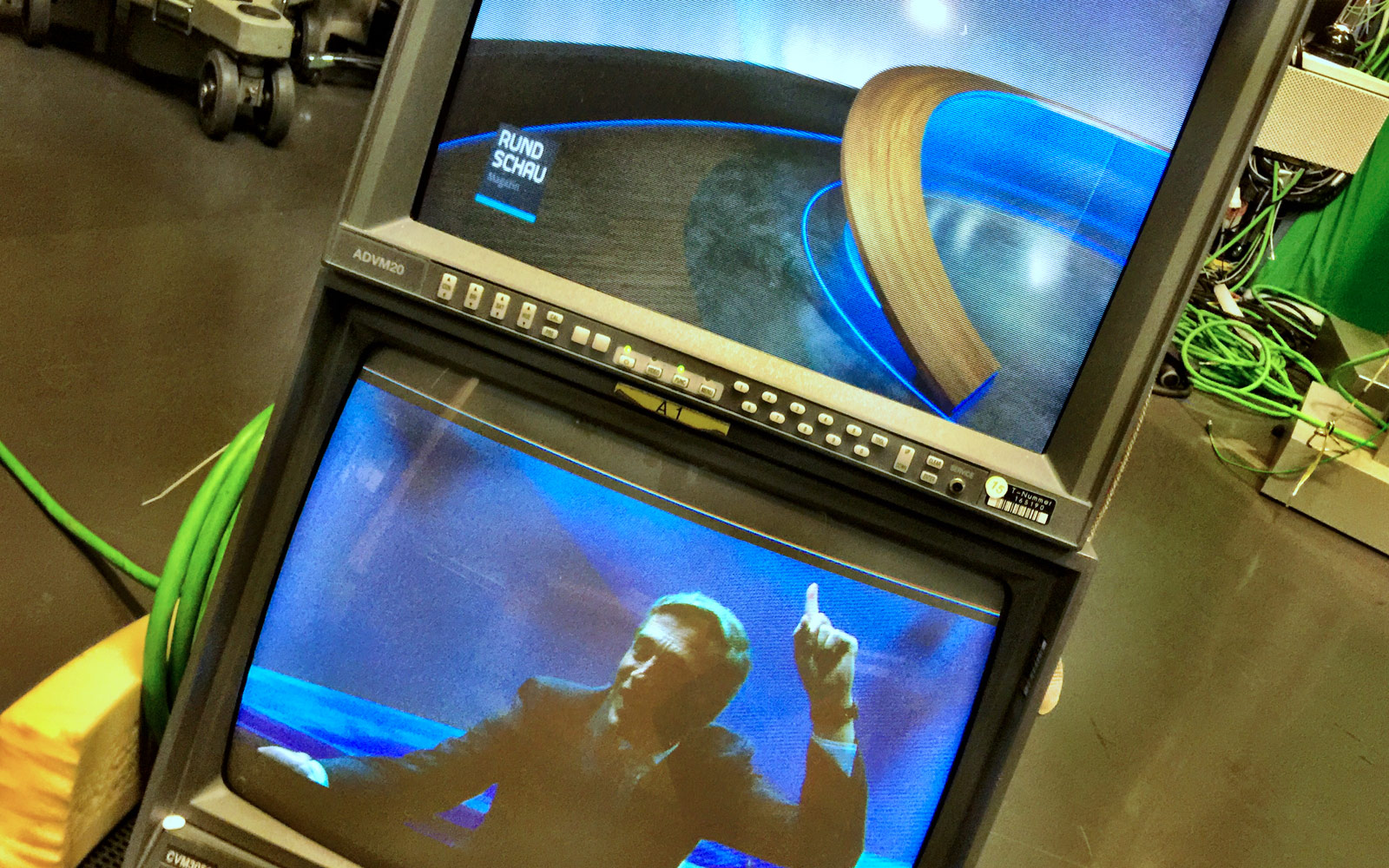 11. April 2016 Erste Sendung mit neuem Gewand und im anderen Studio im Erdgeschoss. Hier fehlen noch viele Funktionen der neuen Rundschau. Aber der Look passt schon mal. Das Studio gehört normalerweise dem Team von „Wir in Bayern“. Die senden jetzt erstmal übergangsweise live aus Unterföhring. Unser altes Rundschau-Studio wird entkernt – und ein modernes HiTech-Greenbox-Studio aufgebaut.