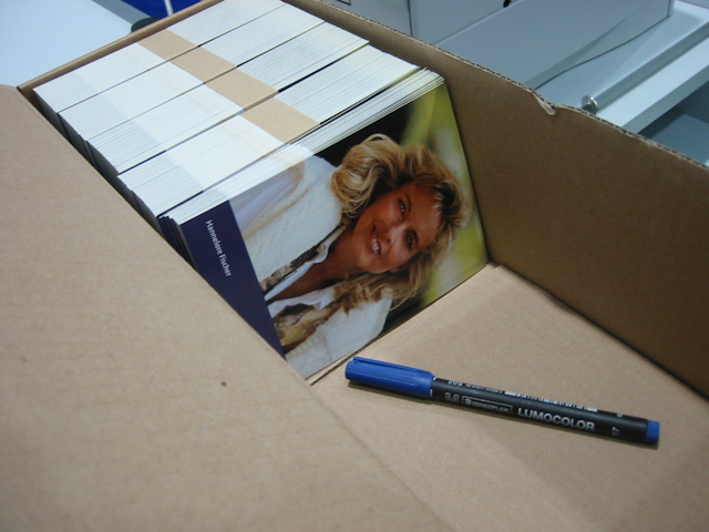 Hansi-Souvenirs: Hansis Autogrammkarten liegen kartonweise bereit. Und die Zuschauer nehmen sie kartonweise mit.