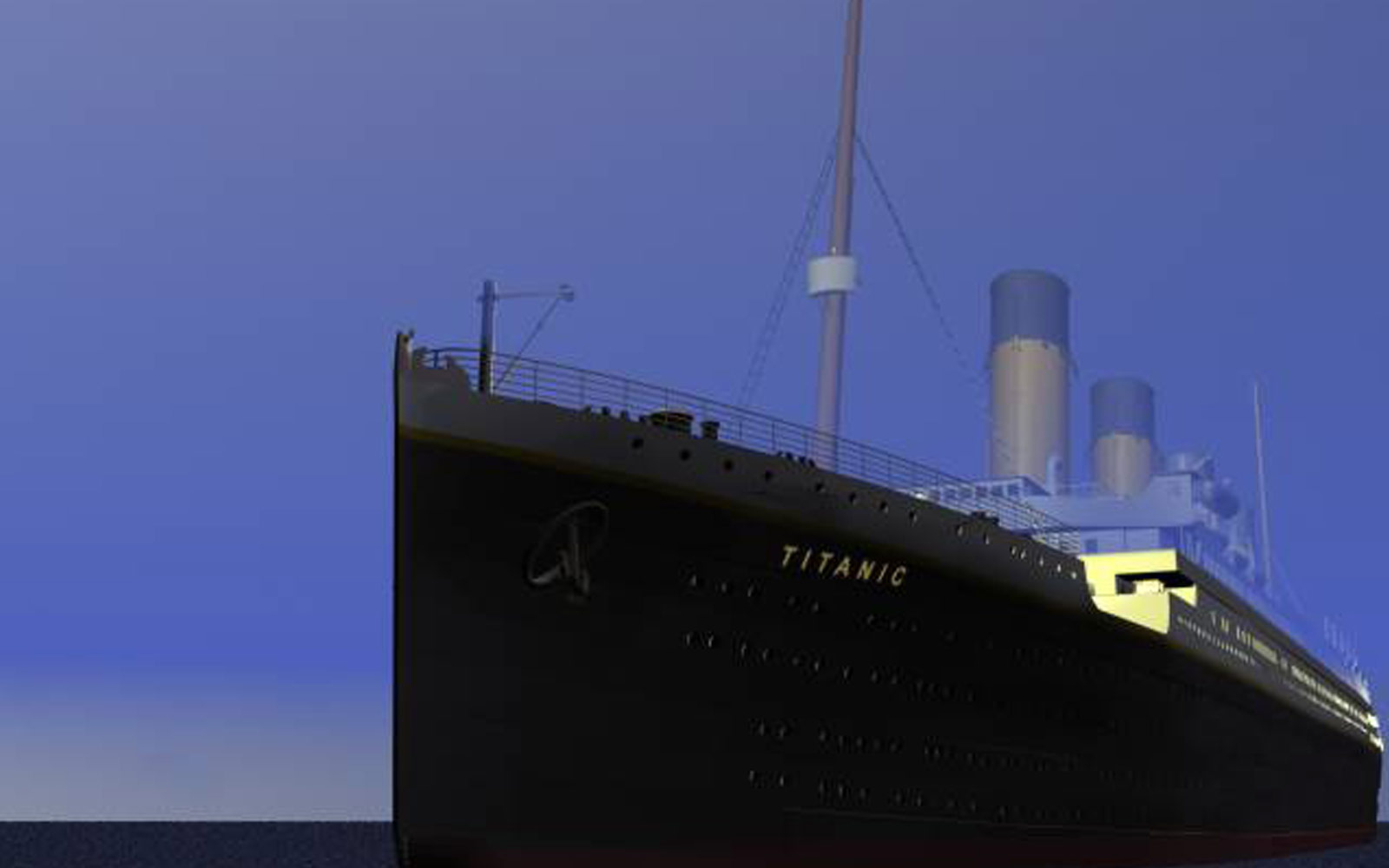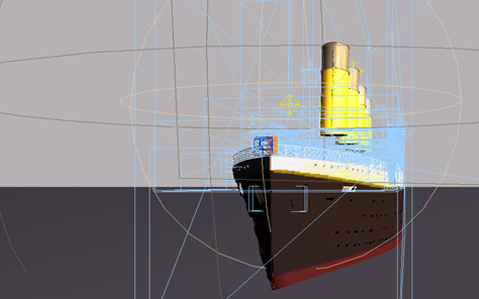 So könnte es laufen: Künstliches Wasser mit Wellenschlag und im Dunst der Entfernung die Titanic II. Fehlt nur noch der Mann an Bord… An Bord? Erste Resultate ein paar Tage später im 3D-Programm „3DMax“: Die Titanic als dreidimensionales Modell. Hier der Blick auf den Bug. Kreter soll später hinter den Streben im Vordergrund stehen. Dabei wird seine Videoszene auf eine kleine Fläche projeziert und die blauen Teile im Bild transparent.