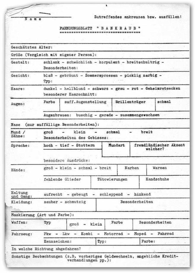 Kleines Orientierungspaper aus den Zeiten meiner Banklehre: Soeben hat sich ein Bankraub ereignet! Äh, wie sah der Mann nochmal aus? Was hat er nochmal gesagt? Und hatte er wirklich ein „schmales Gebiss“? Anbei eine liebevoll getippte Checkliste für die Mitarbeiter…
