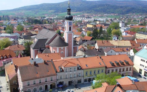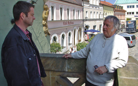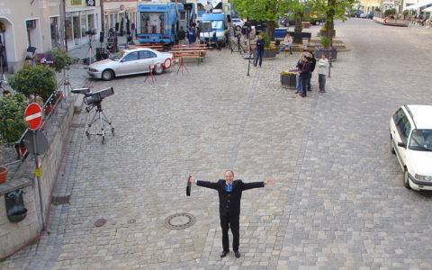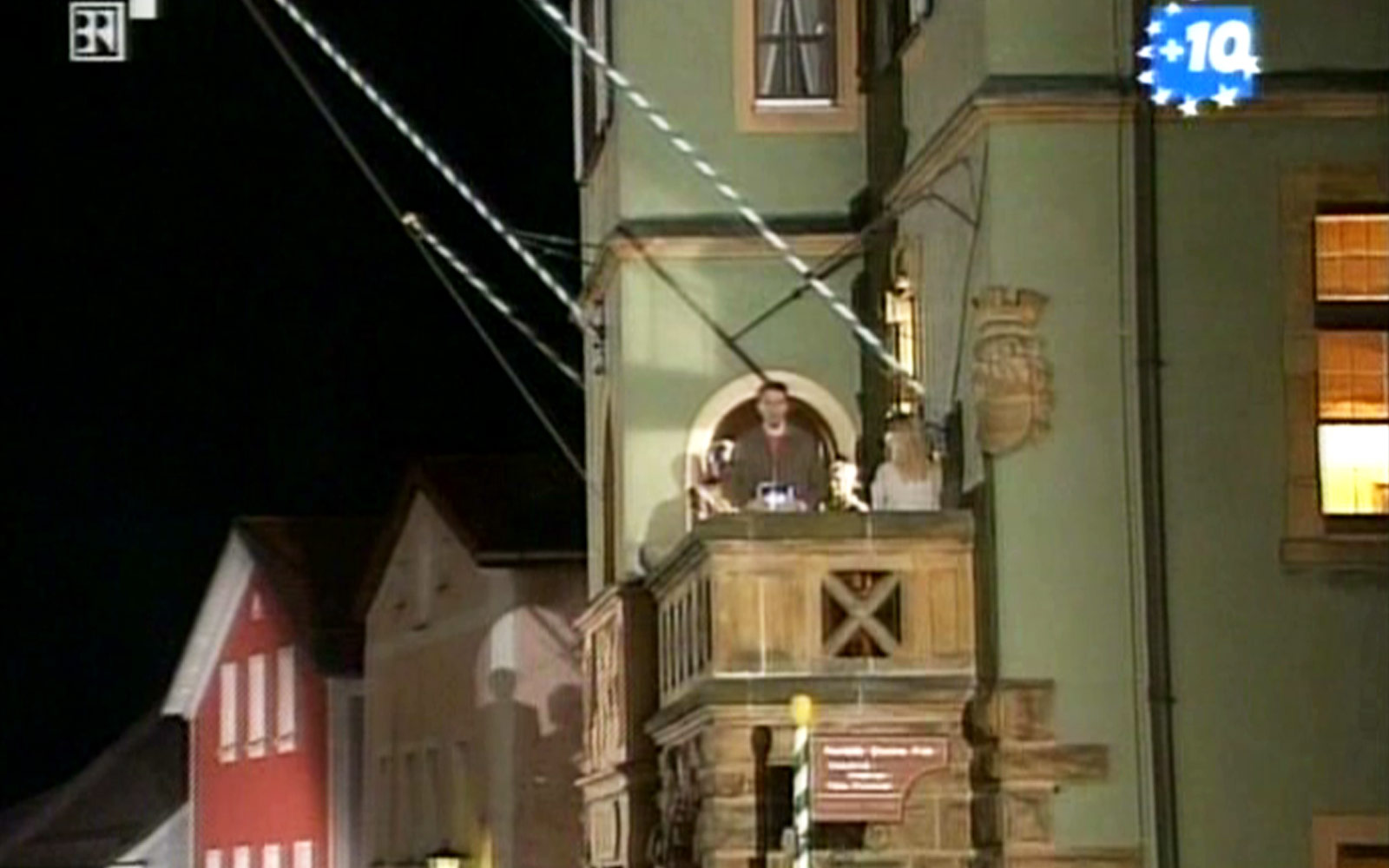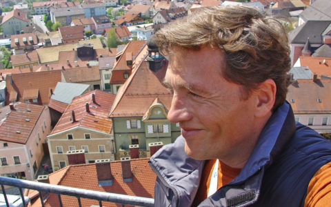 Furth im Wald im besten Licht! Aus einer mittelalterlichen Kulisse kommt Scheider spaziert wie Karl aus dem Karton. Und während der Beitrag läuft, hetzen wir binnen zwei Minuten auf den Balkon des Rathauses.