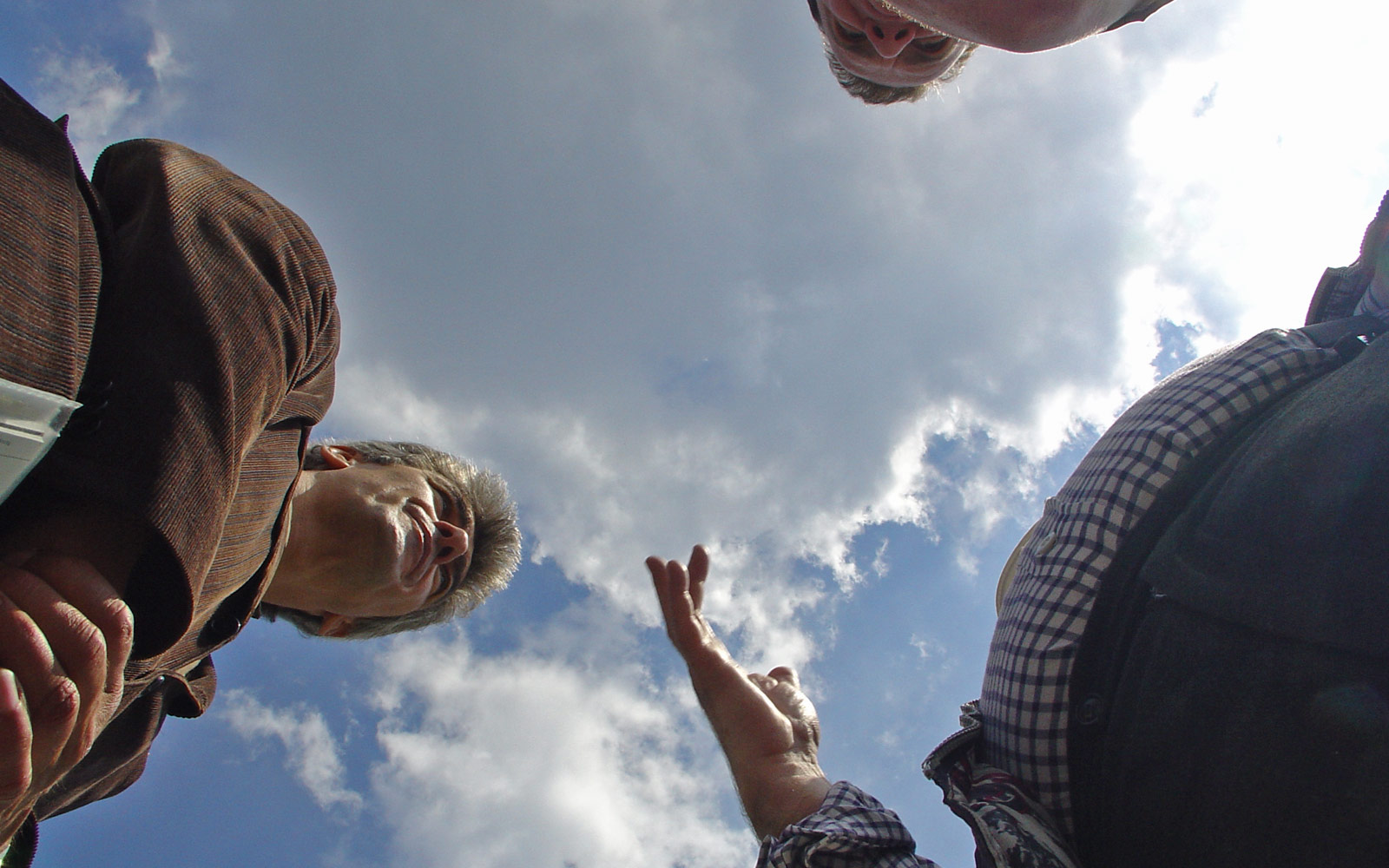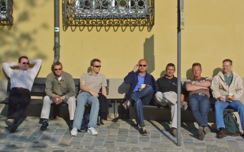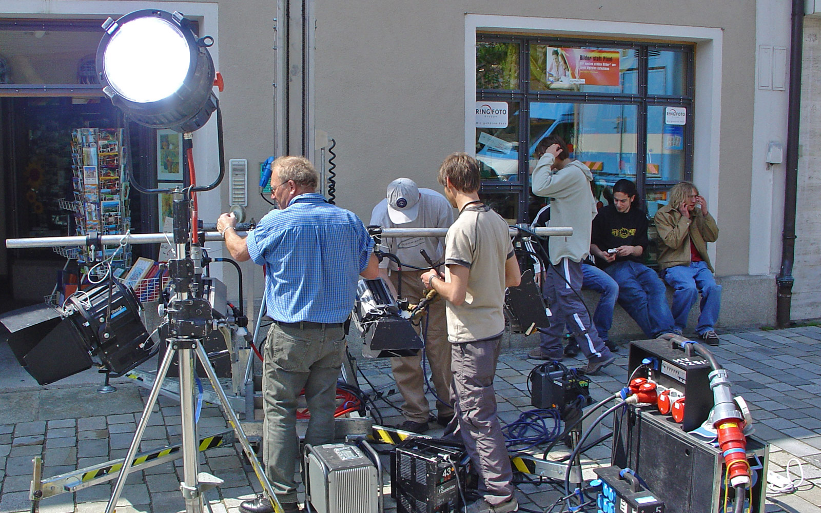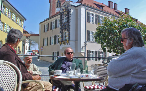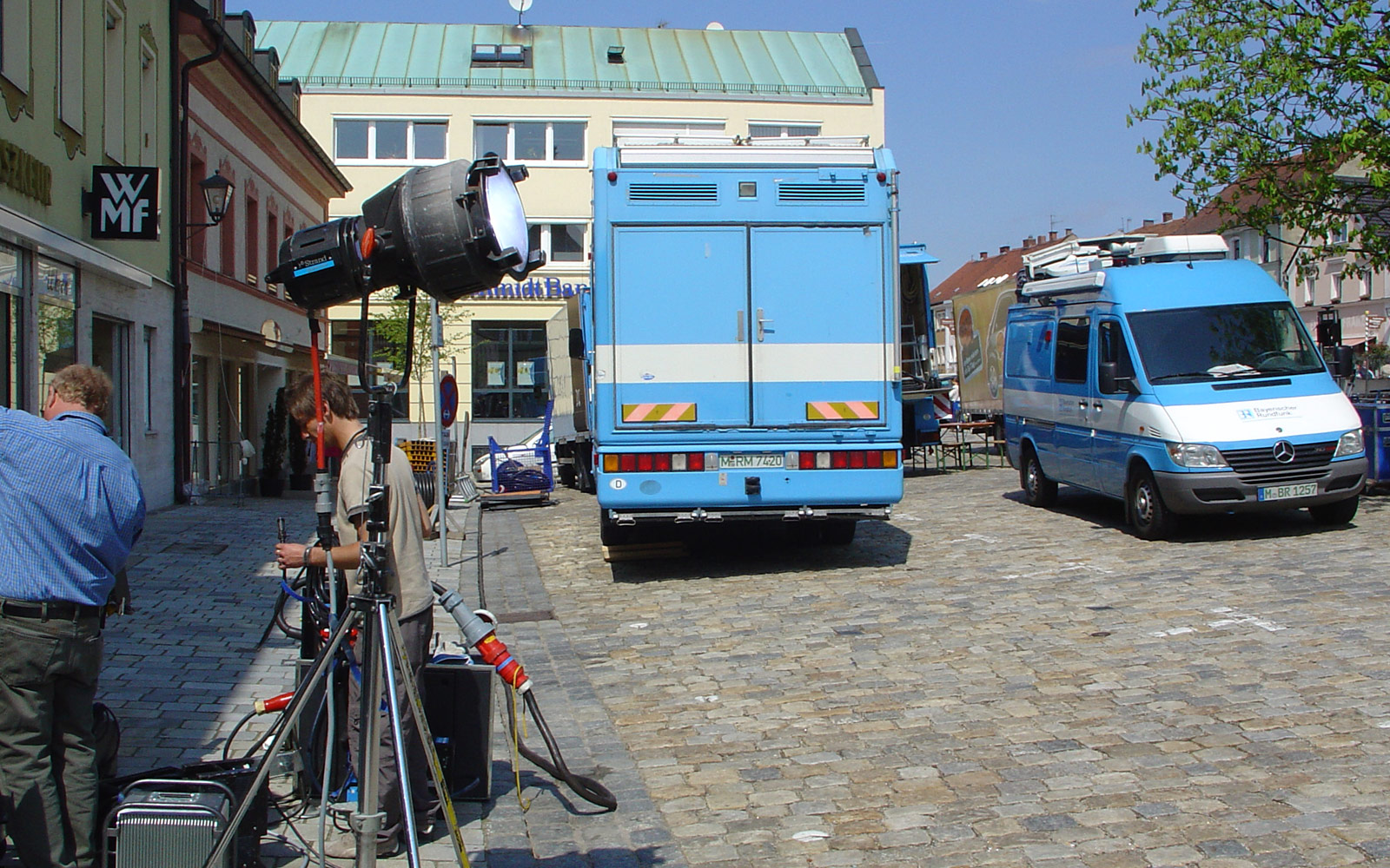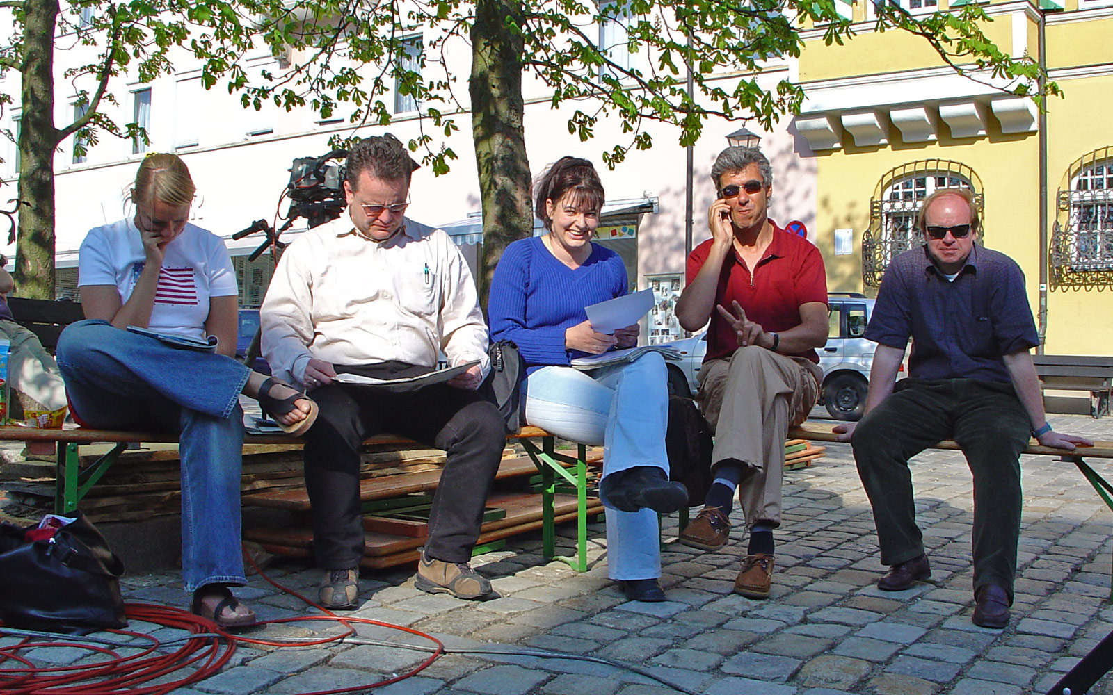 Die Crew holt sich einen Sonnenbrand… Ein kurzes Ausspannen und dann knüppelhartes Arbeiten: Kameraposition auf dem Balkon des Alten Rathauses. Besprechung auf der Bierbank.