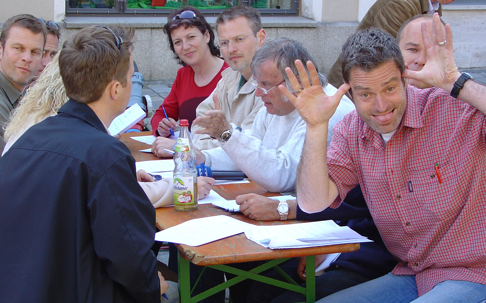 Jeder geht auf Position! Scheider stürmt nach dem fünften Cappuchino den Stadtturm von Furth. Dort soll heute abend das Schlusswort erklingen. Ganz schön hoch und ganz schön viel Treppen. Schon geschafft hat’s Abenschau-Boss Peter Althammer: Siegerpose nach seiner Sendung. Unsere Redaktion brütet indes über dem Sendeplan.