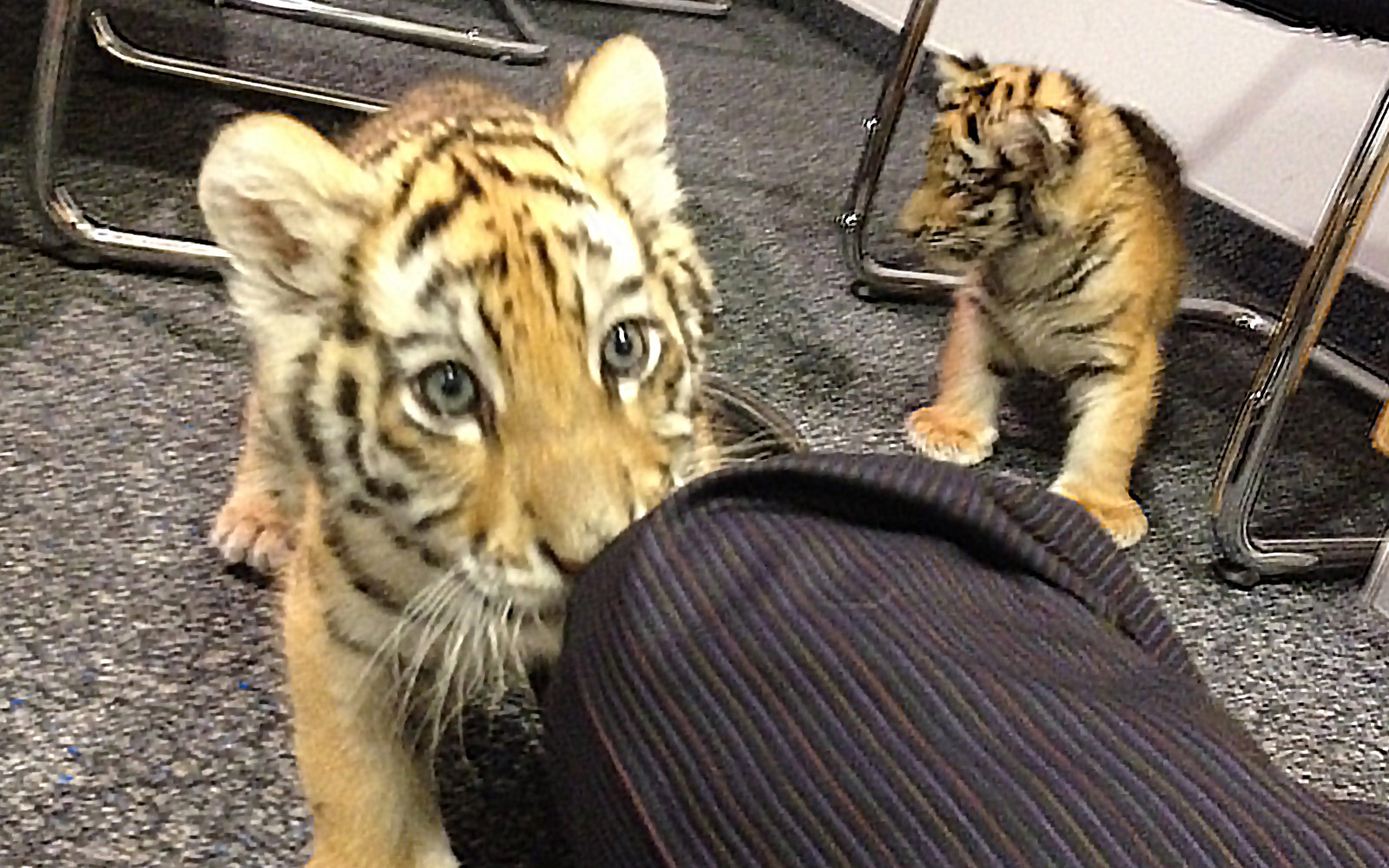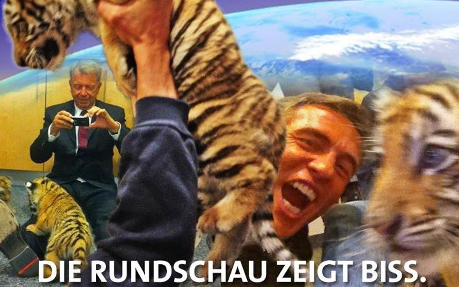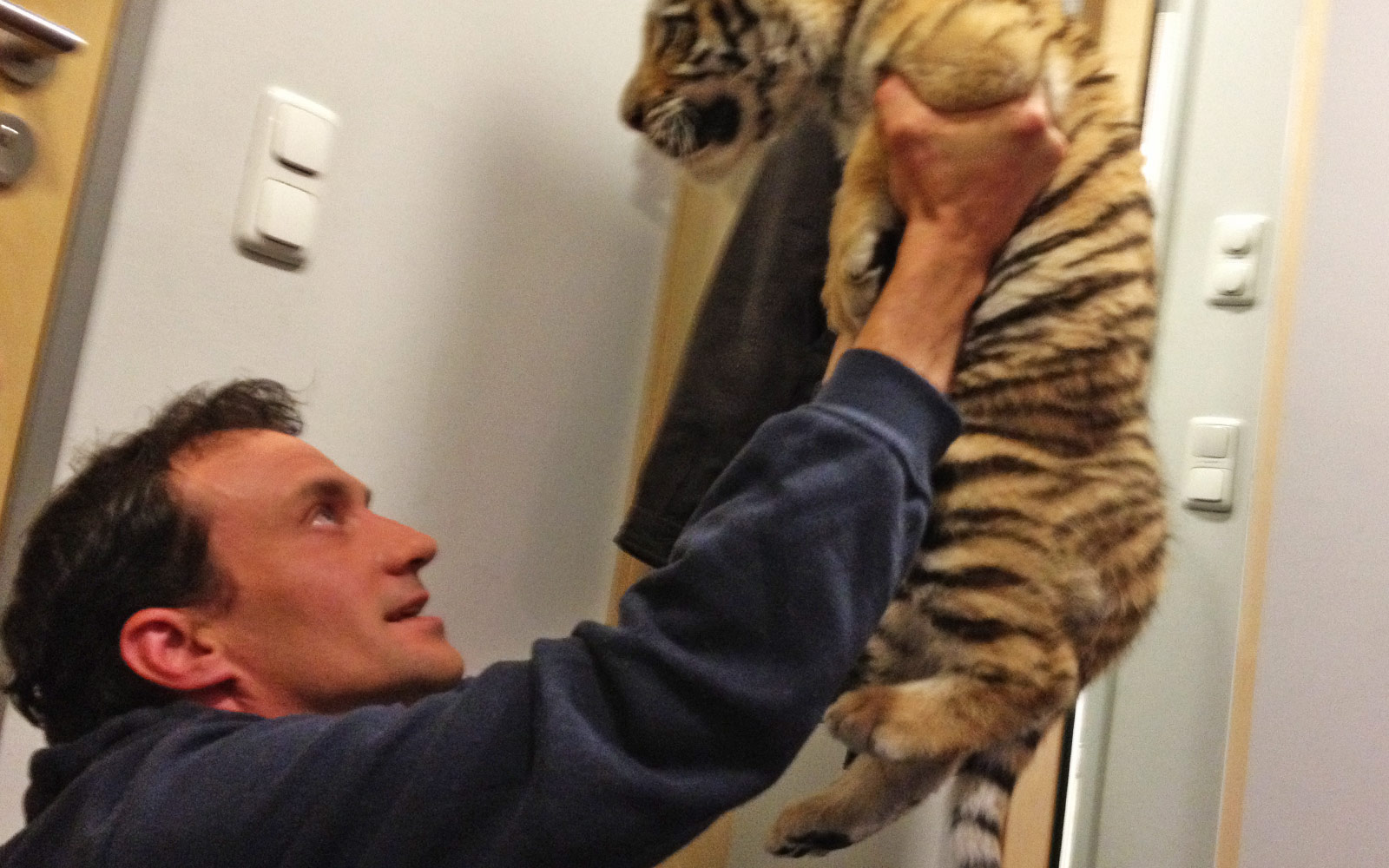 Absoluter Kuschel-Drück-Schmatz-Alarm im BR-Studio Freimann! Ein Tigerzüchter aus Bayern bringt drei Babies mit – für einen TV-Auftritt in der Abendschau am 12.6.2012. Auch wenn wir jetzt stundenlang dagegen wettern könnten (Wildtiere in Shows…) – Stefan hat sich sofort mit den kleinen Wildlingen angefreundet. Wer zuhause zwei Perserkatzen hat, ist sicher auch ein Tigerflüsterer, dachte Scheider. Doch da hatte er sich doch getäuscht. Jedenfalls ging Scheider nach der Begegnung blutend und zitternd in die Rundschau-Sendung…