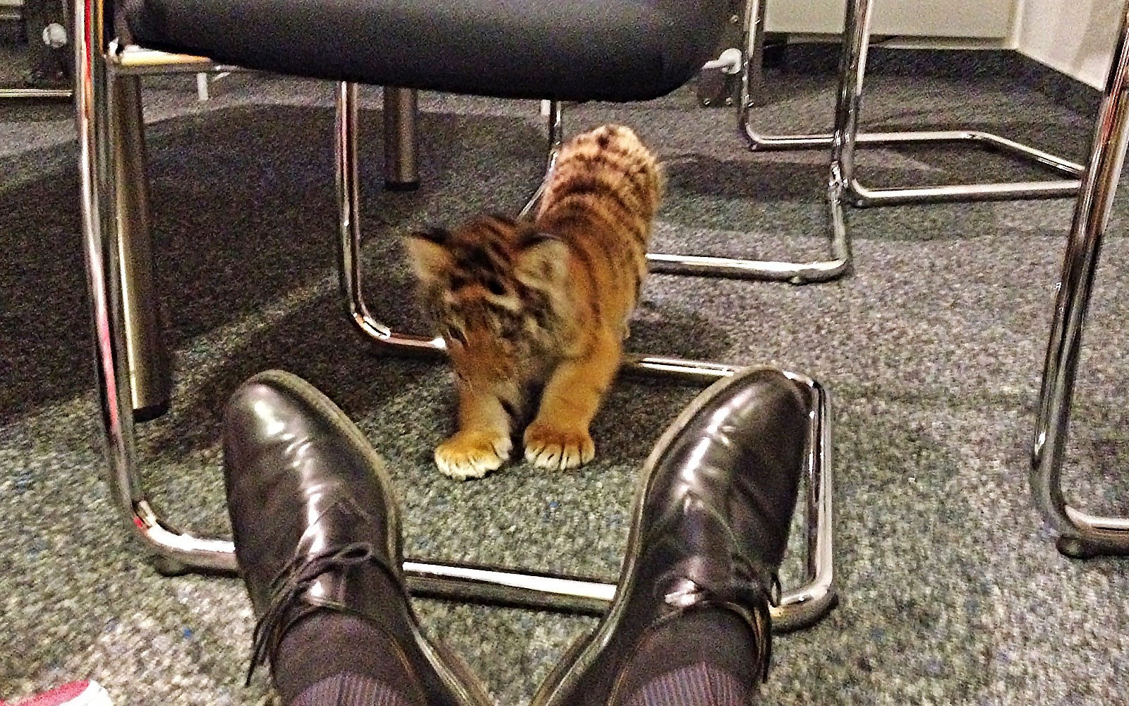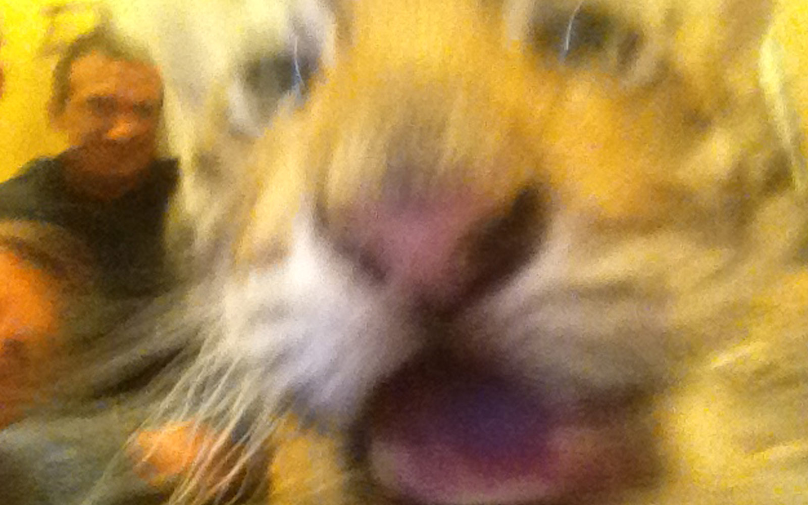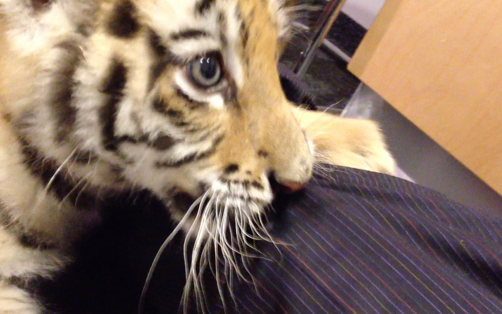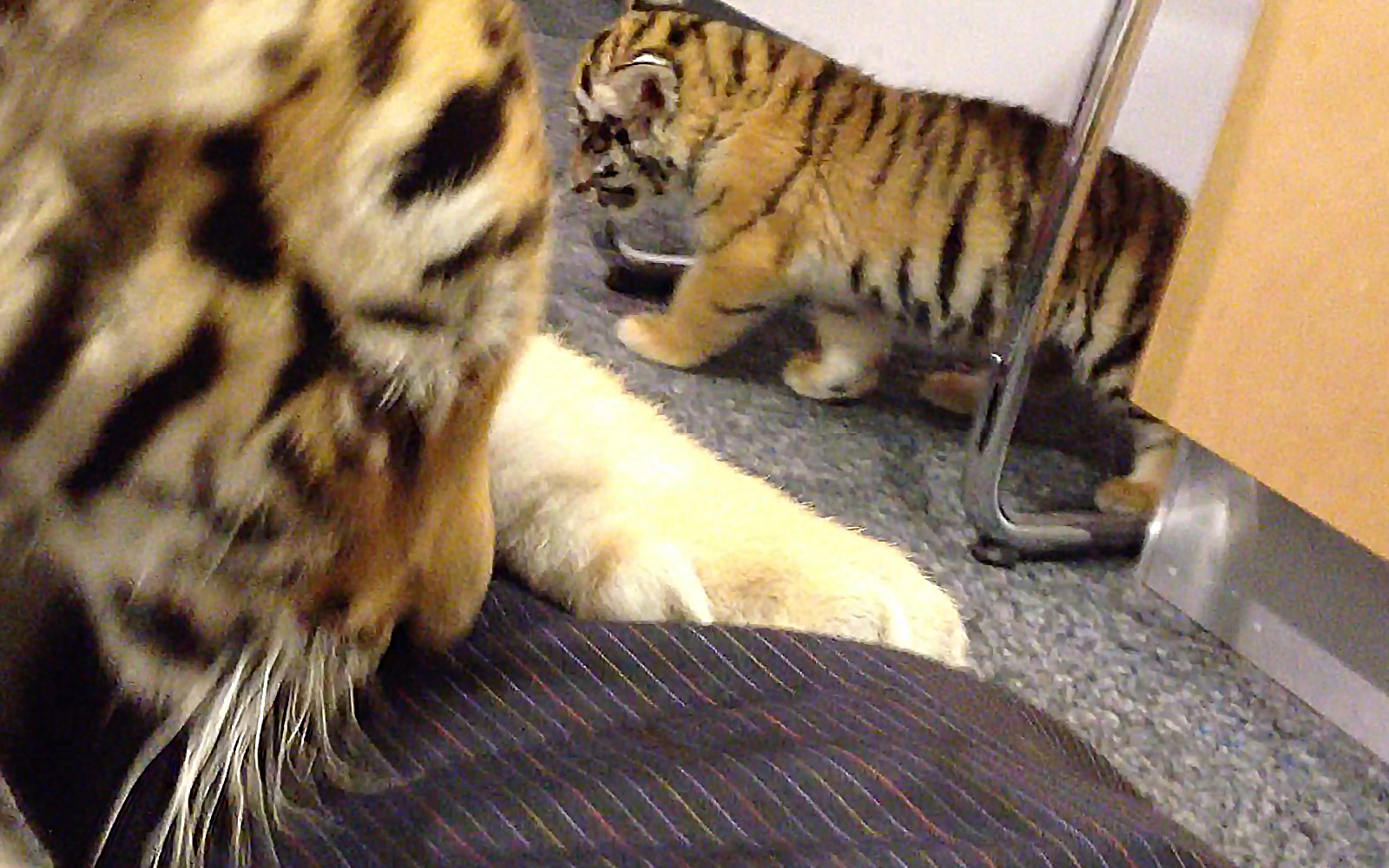 Absoluter Kuschel-Drück-Schmatz-Alarm im BR-Studio Freimann! Ein Tigerzüchter aus Bayern bringt drei Babies mit – für einen TV-Auftritt in der Abendschau am 12.6.2012. Auch wenn wir jetzt stundenlang dagegen wettern könnten (Wildtiere in Shows…) – Stefan hat sich sofort mit den kleinen Wildlingen angefreundet. Wer zuhause zwei Perserkatzen hat, ist sicher auch ein Tigerflüsterer, dachte Scheider. Doch da hatte er sich doch getäuscht. Jedenfalls ging Scheider nach der Begegnung blutend und zitternd in die Rundschau-Sendung…