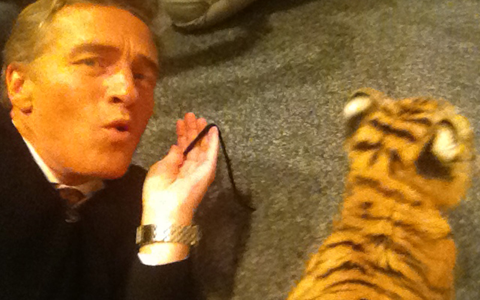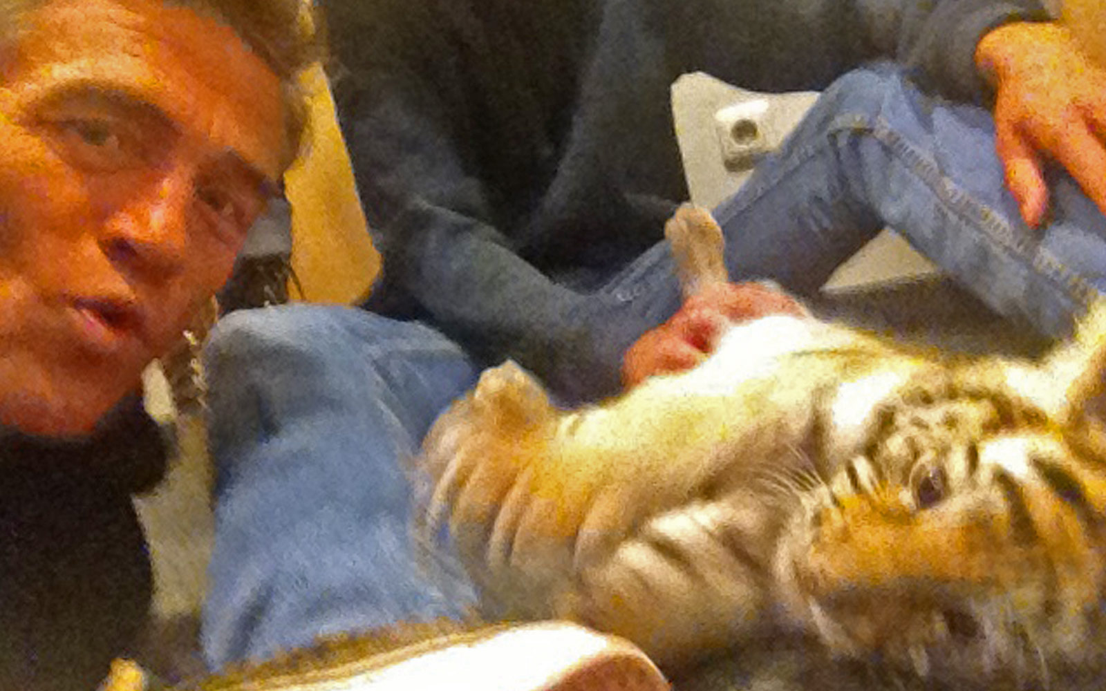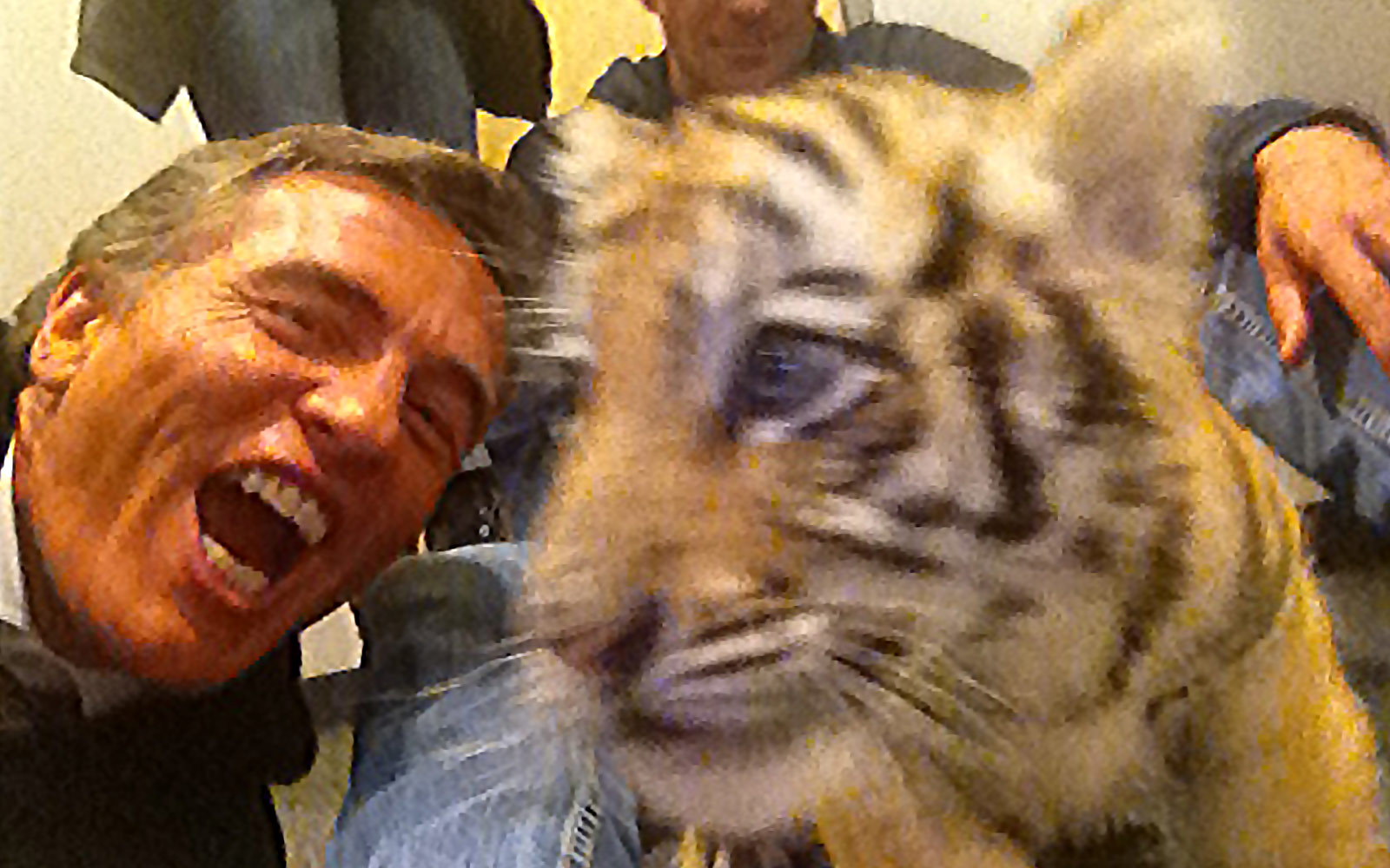 Scheider bietet seine Beine zum Spielen an. Hätte er mal nicht tun sollen. Ein Tigerlein erklimmt sofort das linke Bein und reißt die Hose fast in Fetzen. Tigerbaby? Ja schon, aber ich schwöre Stein auf Bein: Die Urkraft in den Tieren konnte man mehr als fühlen und spüren! So sehr, dass Stefan den Dompteur bitten muss, den Tiger wieder wegzunehmen. Eine ziemlich unheimliche Begegnung. Die Sache endete gut für die Hose (blieb heil). Nur die blutigen Striemen auf dem Bein – die gingen so schnell nicht mehr weg…