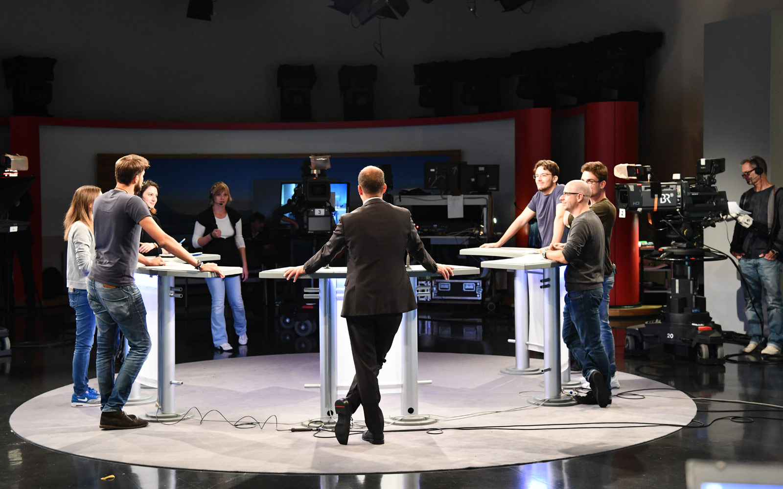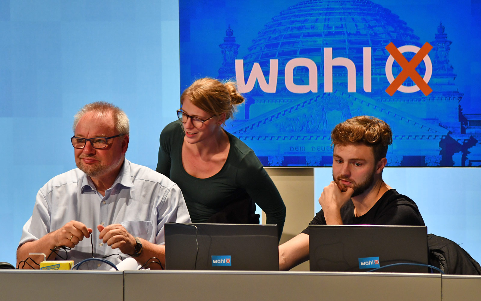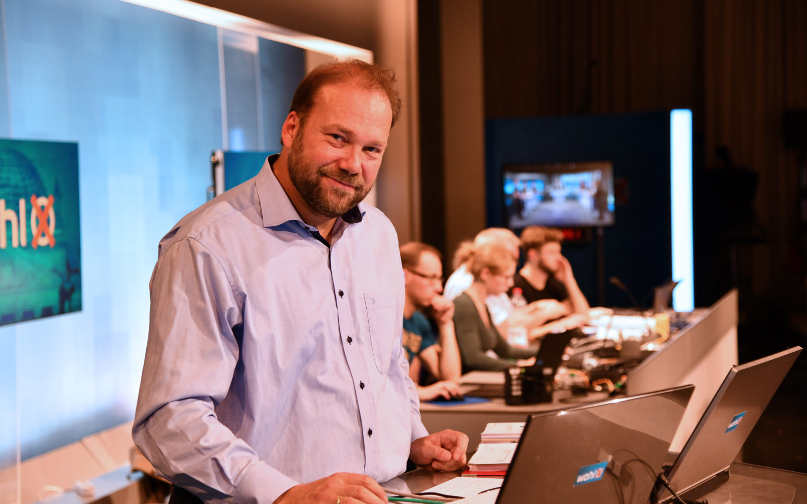 Schon einen Monat vorher kommen die Wahl-Matadore zusammen: Andreas Bachmann als Zahlenzauberer, Franzi Storz als Netz-Scout und Stefan Scheider als Dreh- und Angelpunkt der Sendung! Und dann naht das Wahlwochenende – und alles vibriert schon im Sender. Wir besuchen jetzt mal die Proben am Samstag vor dem Wahlmarathon.