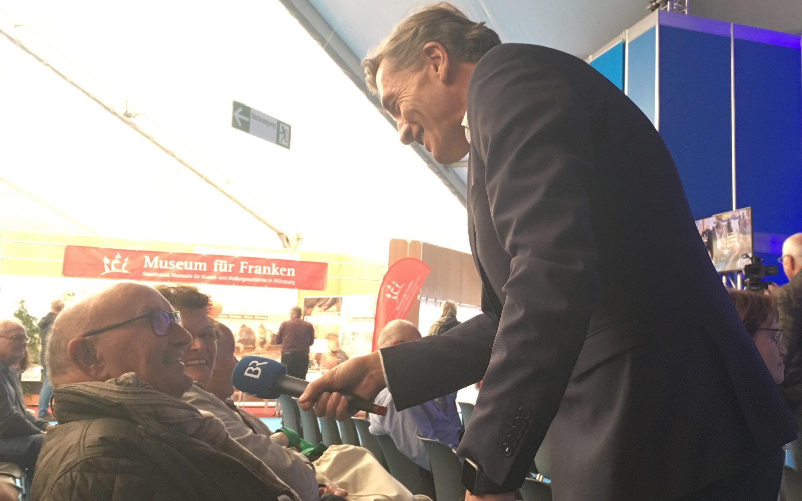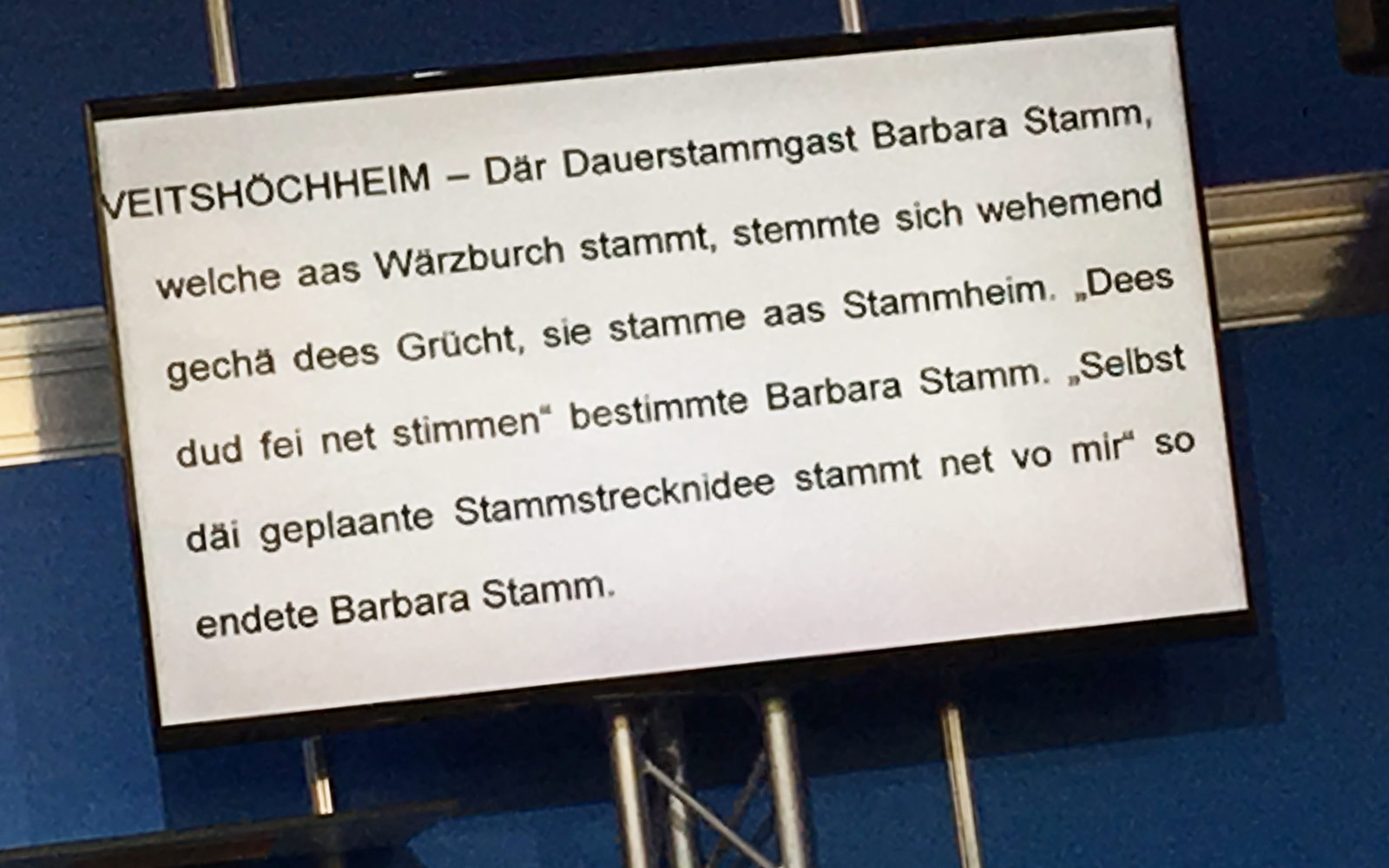 Für den halben Eibelstädter Stefan schon sowas wie ein lustvolles Heimspiel: Auftritt auf der Mainfrankenmesse und Präsentation der Rundschau! Dieses Mal hat Stefan ein Schmankerl im Gepäck: Zuschauer müssen die Rundschau auf „fränggisch“ vortragen!