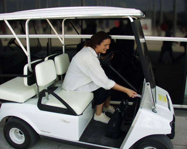 Letzter Rundgang. Faulheit siegt: Ein Caddy muss her! Carmen und Stefan greifen nochmal tief in die Tasche und leihen für einen Hunni einen Golfcaddy. Mit 10km/h geht es vorbei an hunderten von Pavillons. Erschreckt springen die Passanten zur Seite. Carmen reift zur Helldriverin…