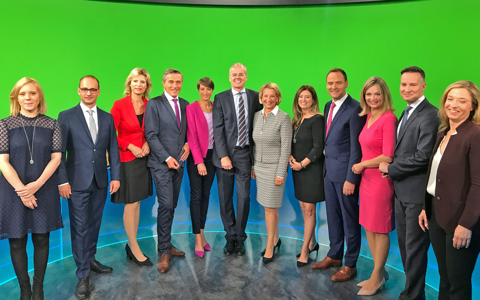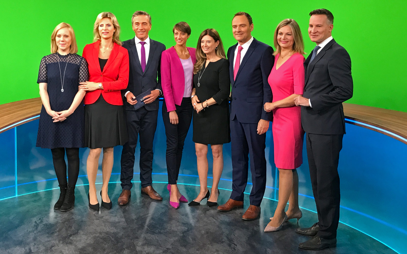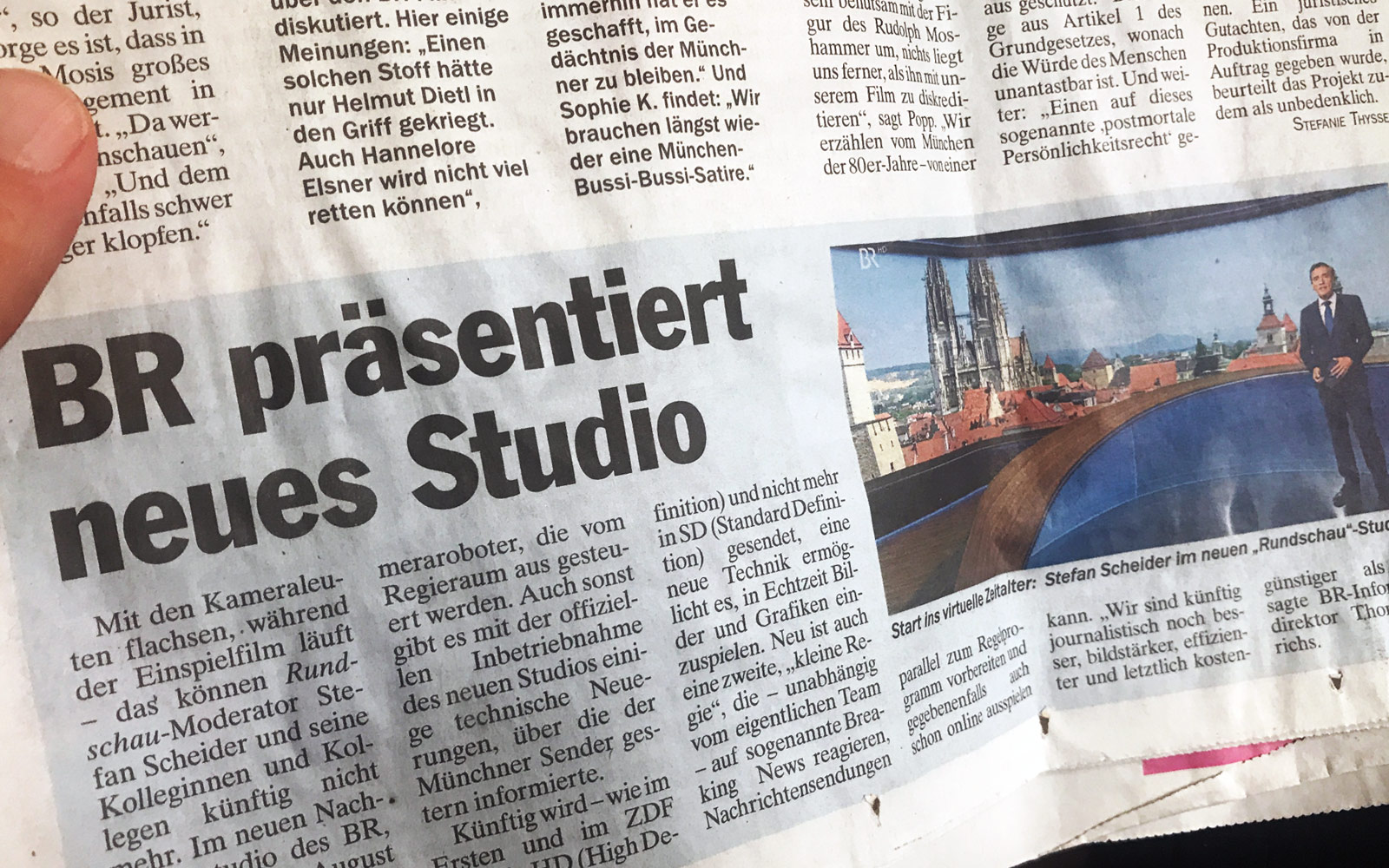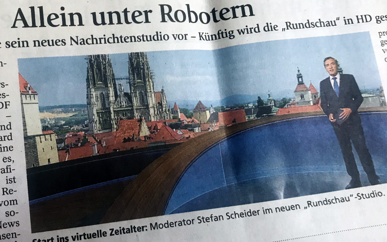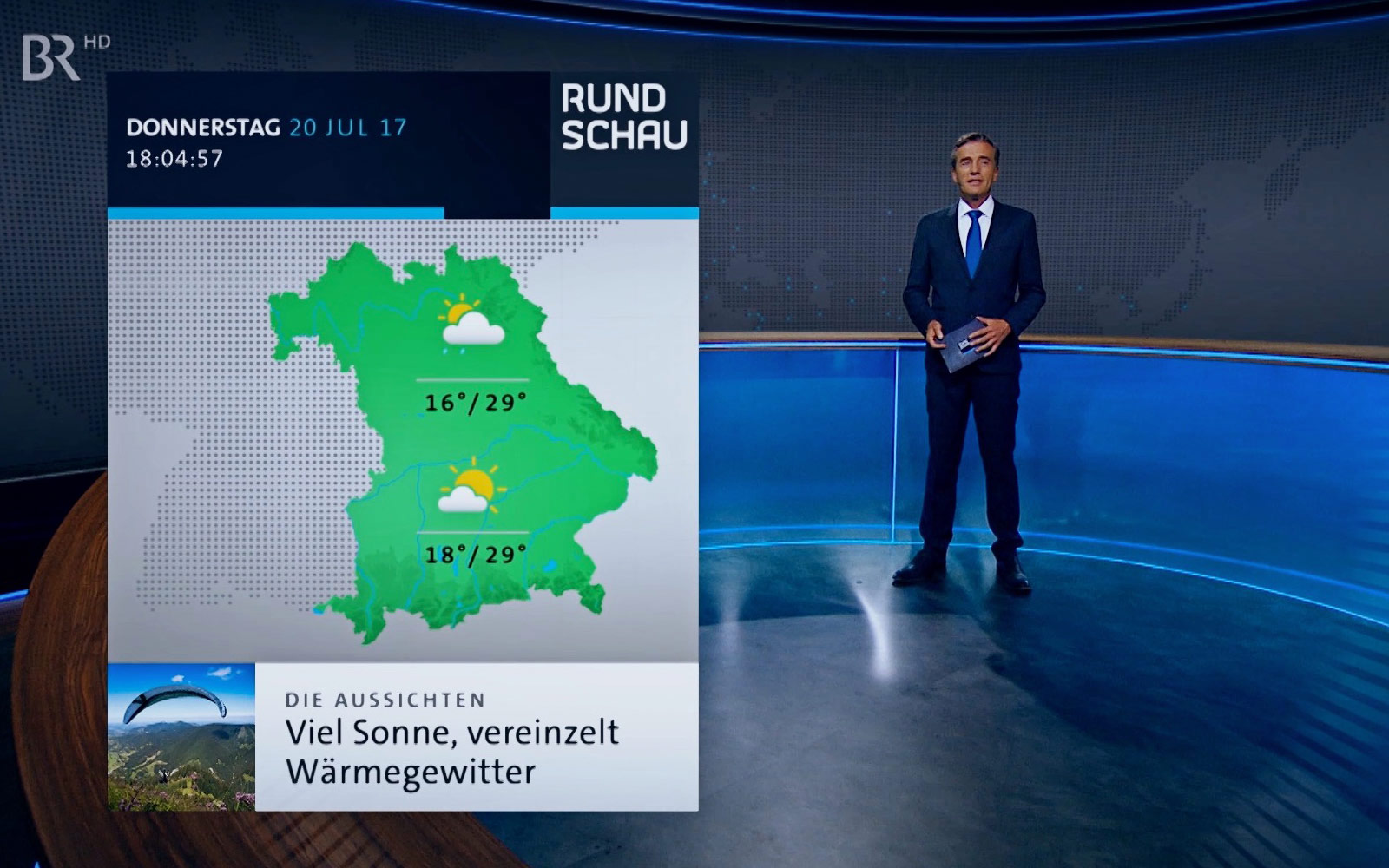 Schon wieder eine neue Rundschau? Hatten wir doch erst im April 2016? Stimmt. Das Design bleibt auch. Doch am 7. August 2017 zündet der BR die nächste und letzte Stufe der neuen Rundschau: Ein hochmodernes Studio mit allen technischen Raffinessen! Da surren Roboterkameras um den Moderator herum – und der steht vor einem grünen Hintergrund – im Fachjargon auch „grüne Hölle“ genannt, weil die Moderatoren sozusagen in einem grünen „Nichts“ stehen. Bedruckte Fototapeten sind passé – jetzt liefert der Computer die Bilder im Hintergrund. Ein Meilenstein in der Rundschau-Historie.
