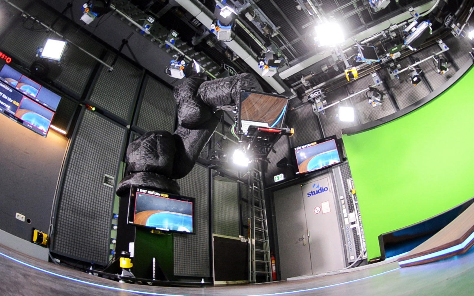 Kamerarobotik: ein Roboterarm der Fa. Camerobot (ortsfest), zwei fahrbare Robotik-Stative der Fa. Shotoku, alle drei Kameras fernsteuerbar über ein Shotoku-Panel und Touchscreens