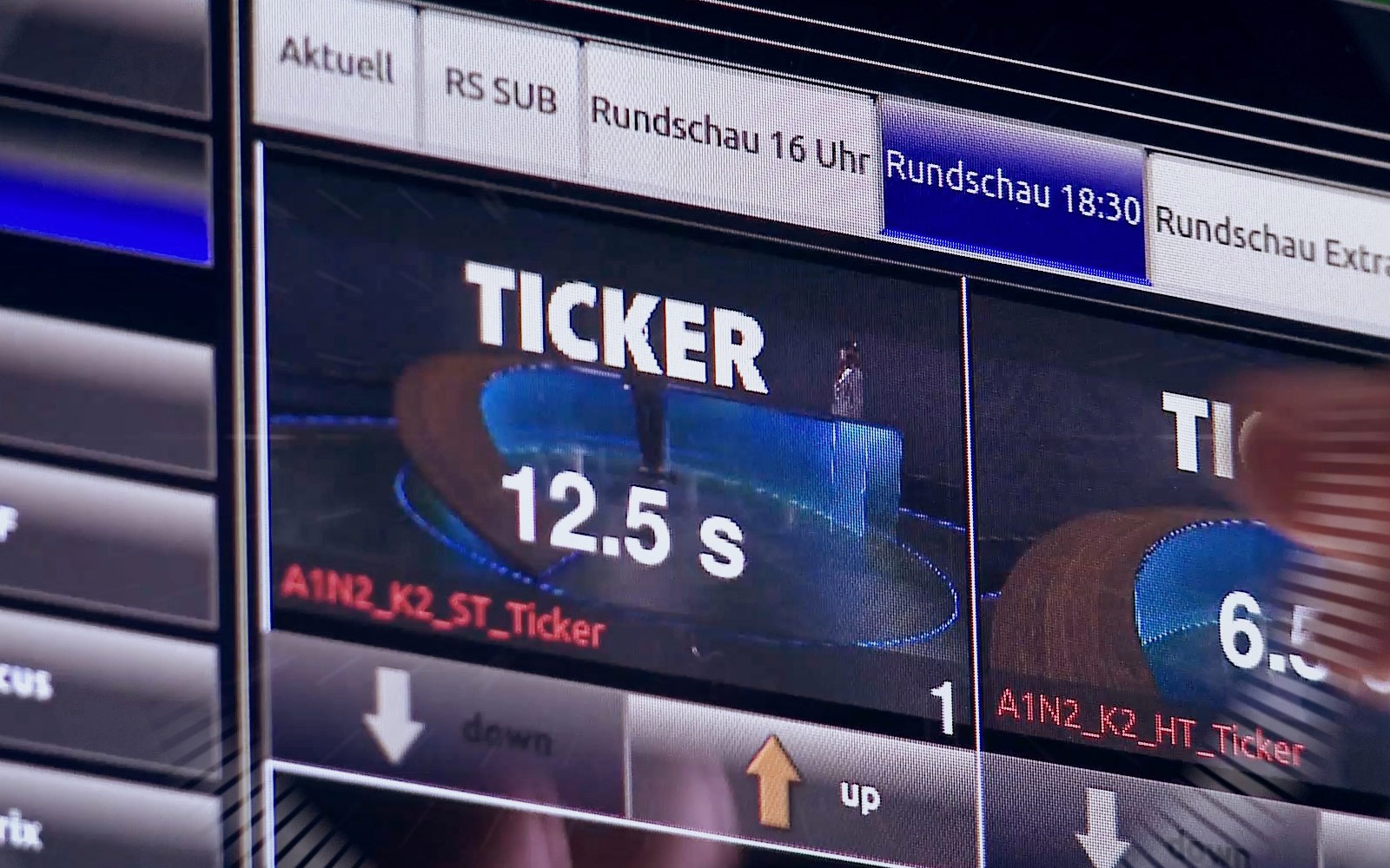 Grafik und Automationssystem: Vizrt Opus (2-kanaliges Echtzeitgrafiksystem mit integrierter Mosart Regieautomation, acht Videoeingänge, externes Audiopult Stagetec OnAir 24)