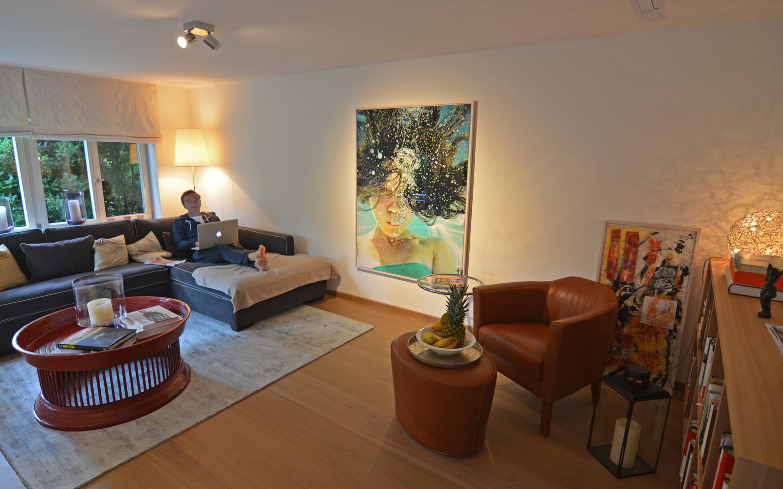Ich habe vor kurzem mit dem Malen angefangen. Und da wünschte ich mir ein kleines Atelier, das in Griffweite zu Esszimmer, Schlafgemächer und Bad läge – also irgendwie ein Raum zum Klecksen gleich nebenan. So ein Refugium hätte ich noch gerne. Und: Sollte ich jemals weg- oder umziehen – dann bitte nur noch mit Dachterrasse! Mehr fällt mir gerade nicht ein, was aber auch daran liegt, dass ich mit meinem Zuhause heute und hier sehr, sehr glücklich bin!