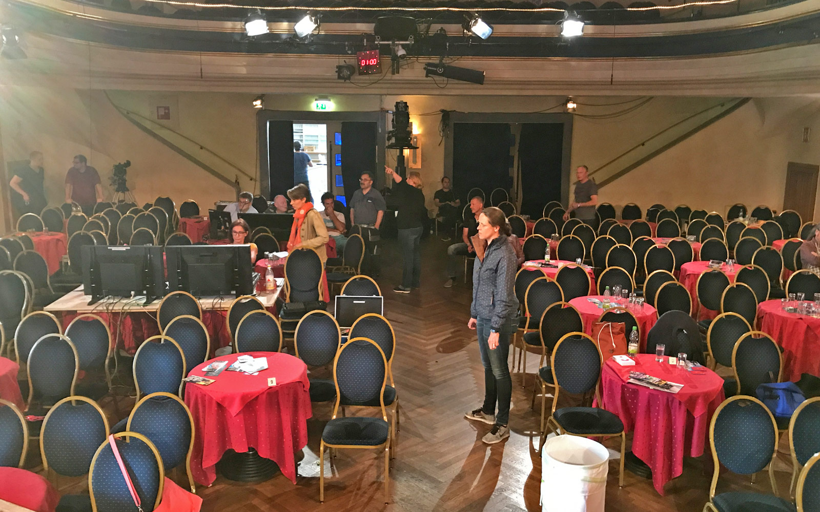 Vorbesprechungen, Einpegeln, Proben und dann warten. Stefan genießt einen lockeren Samstag in Fürth – und kauft sich sogar noch ein fränggisches Wöddabuch, das er in der Sonne liest. Eine gute Vorbereitung, denn auf der Bühne wird fast nur fränkisch gesprochen. Gegen 15.30 Uhr dann eine kleine Probe mit Stefan: Die Kameras fangen ihn ein, die Lichtmacher jagen ihre Scheinwerfer auf Stefan und die Tonleute regeln den Rest. Passt alles – jetzt heißt es warten bis 19 Uhr. Und übrigens: Stefan und auch die anderen zwei Ehrengäste haben nicht den blassesten Schimmer, was sie erwartet! Wir sind völlig ahnungslos! Wir dürfen auch nix wissen, denn alles soll spontan kommen. Alleine das schüttet eine ordentliche Portion Adrenalin aus…;-)