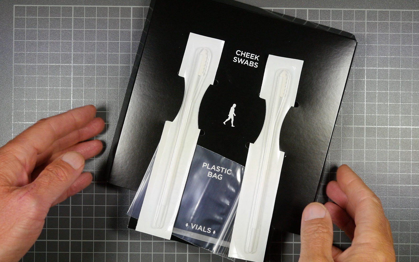 Ein wattierter Umschlag liegt bei, um meine Erbinfos sicher und gut gepolstert nach Houston zu schicken. Ich packe vorsichtig die Stäbchen aus. Jedes für eine Wange-Innenseite. 45 Sekunden schaben. Ach ja, eine Stunde lang vorher nix essen, trinken oder rauchen! Dann ein Röhrchen öffnen und das Pad am Ende des Stäbchens hineindrücken. Schwupps, schon passiert. Das Mini-Wattepad mit meiner Spucke landet in einer Flüssigkeit. Röhrchen zuschrauben, fertig. Das gleiche Spiel mit der anderen Wange. Fertig!