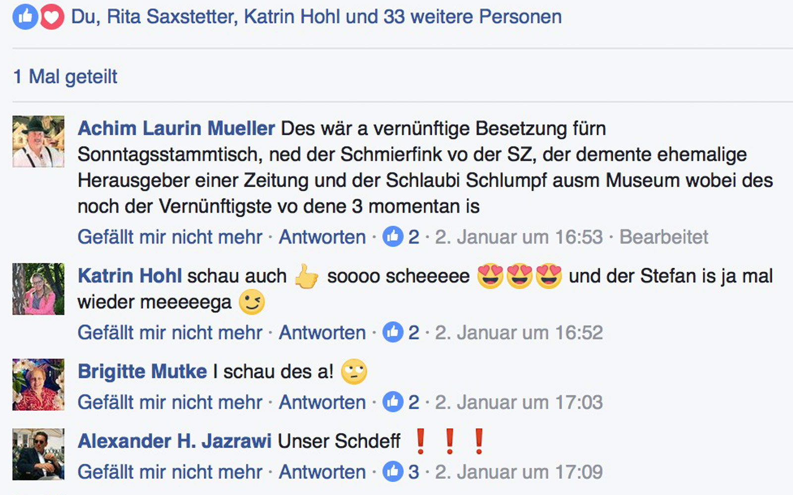 Nach der Sendung steht Stefan immer ratlos und unsicher da: Was hab ich da heute wieder alles geredet! Bestimmt viel Schmarrn, aber auch manchen Satz, der eben aus dem Bauch kommt. Stefan durfte schon zum zweiten Mal an der beliebten Wir-in-Bayern-Neujahrsrunde teilnehmen – meist neben dem großartigen Pfarrer Rainer Maria Schießler. Und wir ergänzen uns wunderbar: Er gibt auf große Fragen die gut verdaulichen Antworten – und Stefan garniert die Themen aus der Sicht des ruhigen News-Ankers – obwohl seine Rundschau nur ein paar Minuten später beginnt. Offenbar ein Erfolgsrezept – wie die Einschaltquoten zeigen…;-)