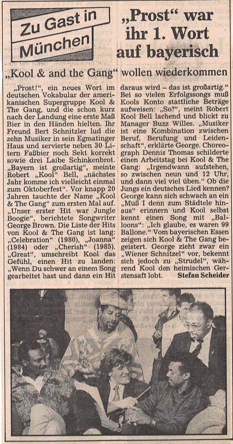 Das war schon ein Ding im Dezember 1988! Im kleinen beschaulichen Egmating südöstlich von München hieß es plötzlich: Heute Abend kommen Kool & the Gang. Und Jung-Moderator Scheider soll die Superstars interviewen. Hab ich erst geglaubt, als ichs gesehen habe: Und saß plötzlich mit der Truppe auf dem Wohnzimmer-Sofa! Ich hab sie „99 Luftballons“ singen lassen und ihnen supernaive Fragen gestellt. Aber lustig wars trotzdem…;-)