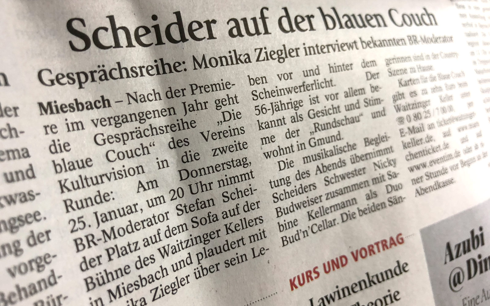 Nach dem erfolgreichen Start des neuen Formates „Blaue Couch“ im Januar 2017 mit dem Zither-Manä wird die Reihe mit einem weiteren Prominenten aus dem Landkreis Miesbach fortgesetzt. Jeder kennt sein Gesicht und seine unverwechselbare Stimme, mit der er kompetent und charmant gleichermaßen die Nachrichten der „Rundschau“ im Bayerischen Fernsehen moderiert: Stefan Scheider. Aber das ist nicht alles, was der Gmunder tut. Im Gespräch mit Monika Ziegler plaudert er über das Leben im Scheinwerferlicht und dahinter. Die musikalische Begleitung übernimmt Stefan Scheiders Schwester Nicky Budweiser mit Sabine Kellermann. Das Duo nennt sich Bud’n’Cellar, es legt Wert auf schönen Gesang und natürlich schöne Songs… just listen! (Auszug aus dem Programmheft)
