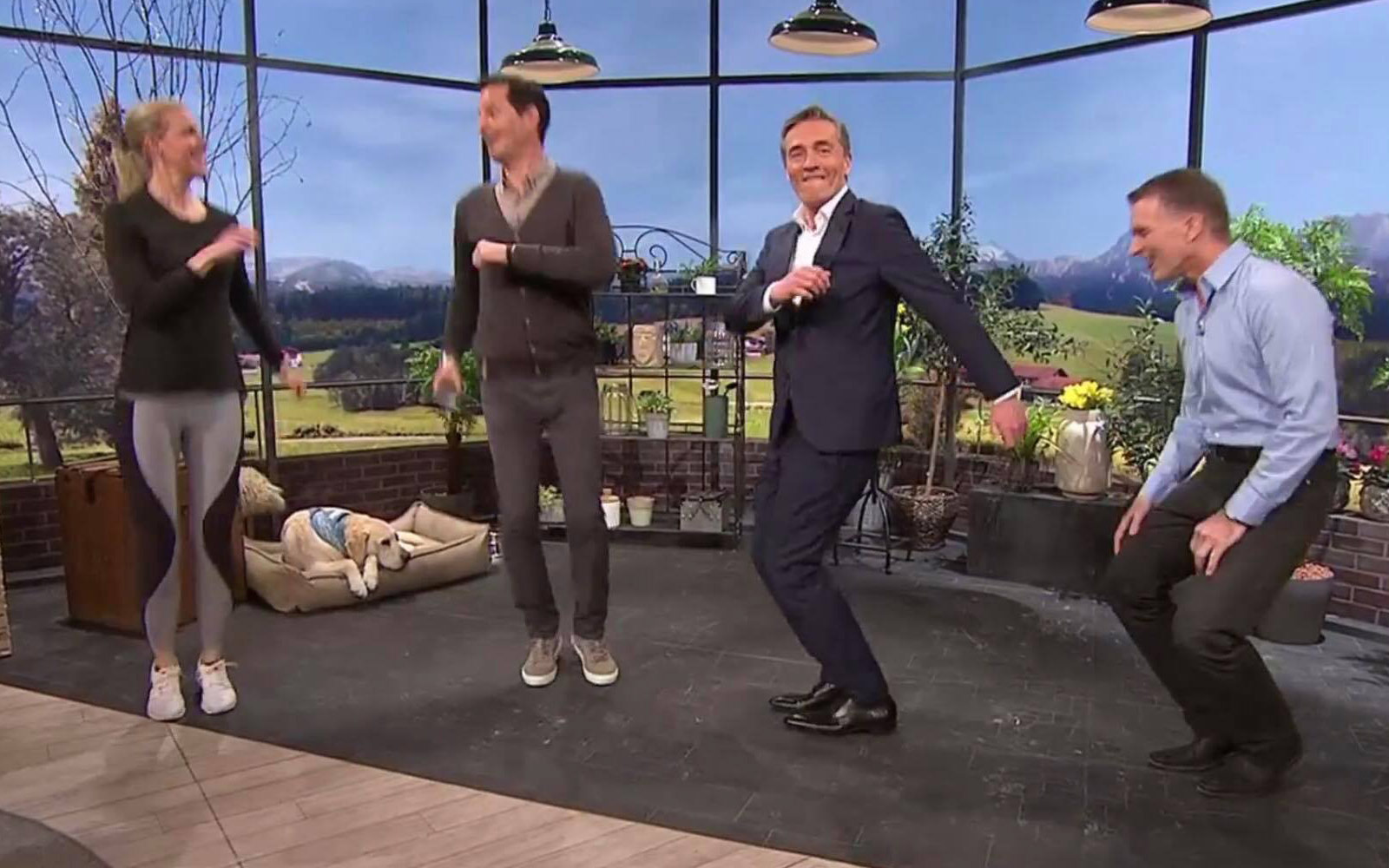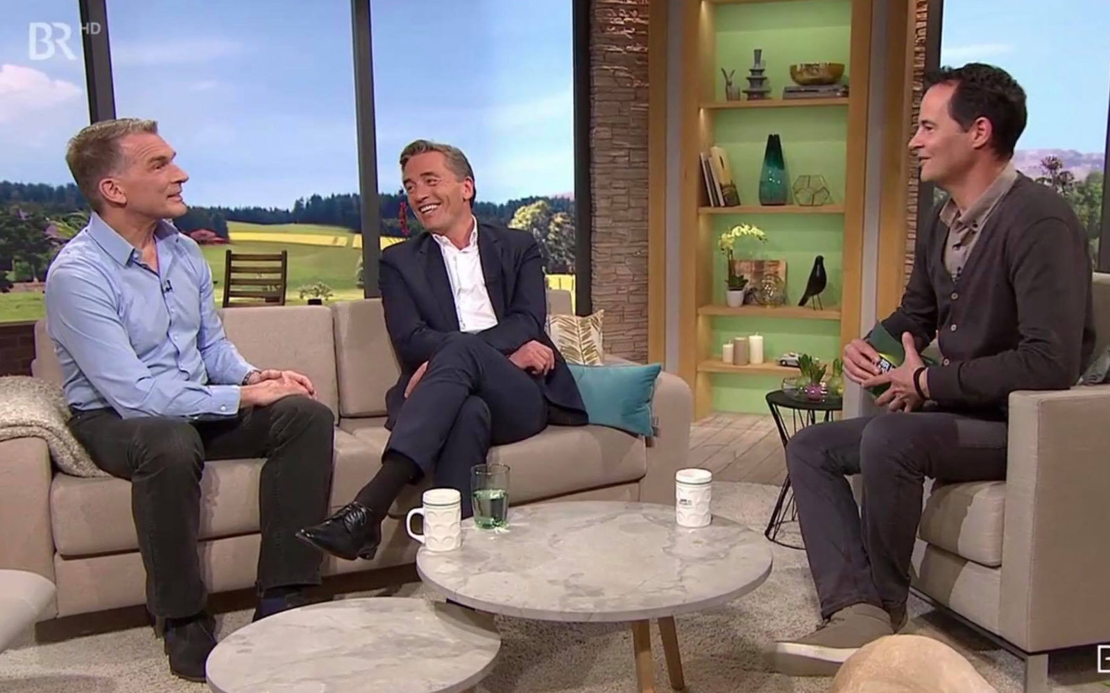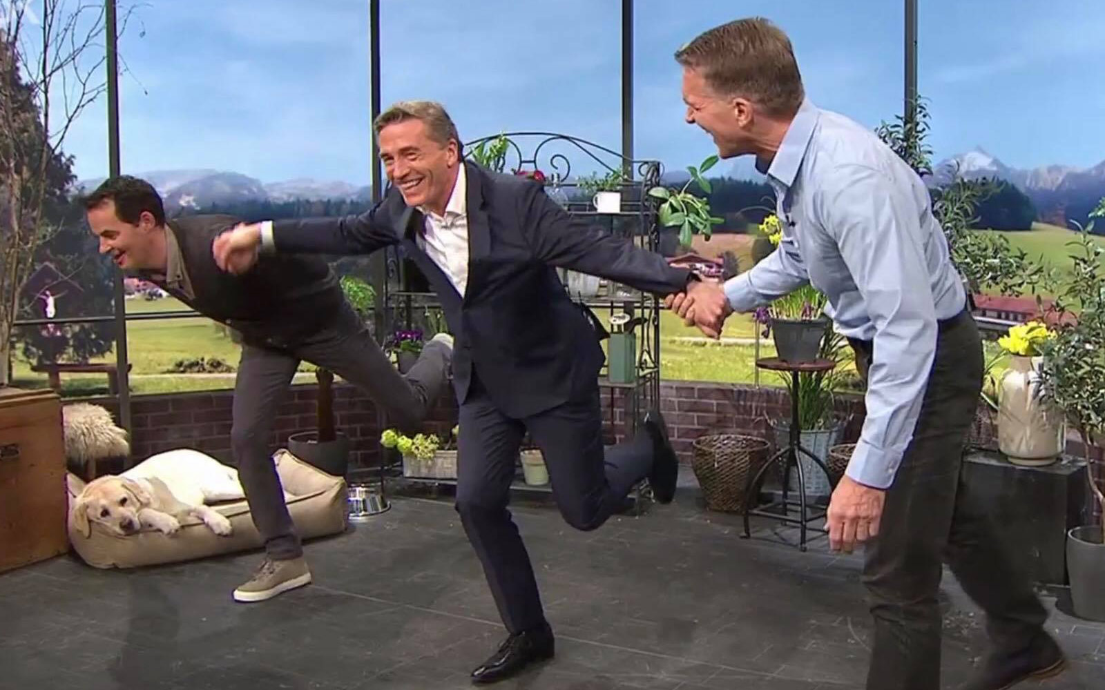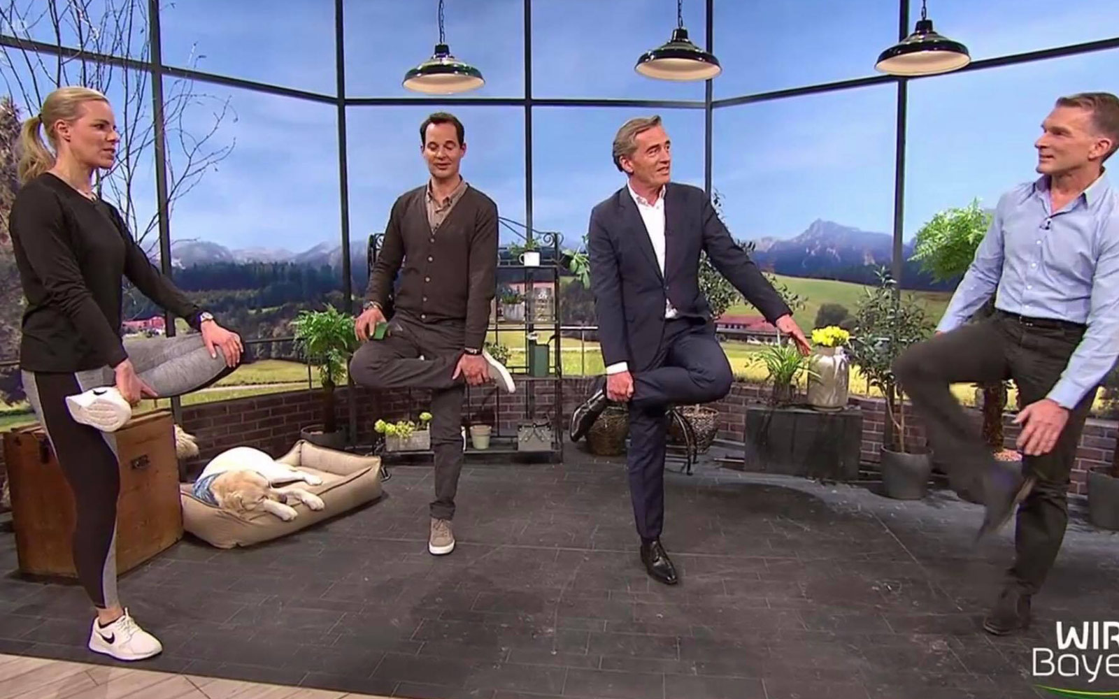 Stefan erscheint am 19. März 2018 im Wir-in-Bayern-Studio – allerdings ein wenig „overdressed“. Für die Übungen von Andrea Sixtus eignet sich der dunkelblaue Anzug mit Hosenträgern und weißem Hemd nur bedingt…;-) Egal, wir starten die Sendung um 16.15 Uhr gleich mal mit Hüpfen, Drehen und Dehnen! Und schon macht es „zoing!“ und ein Hosenträger löst sich mitten in der Übung! Hat aber zum Glück niemand gemerkt…