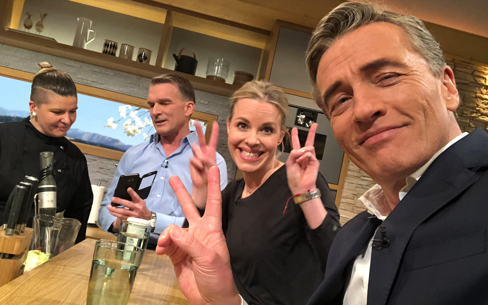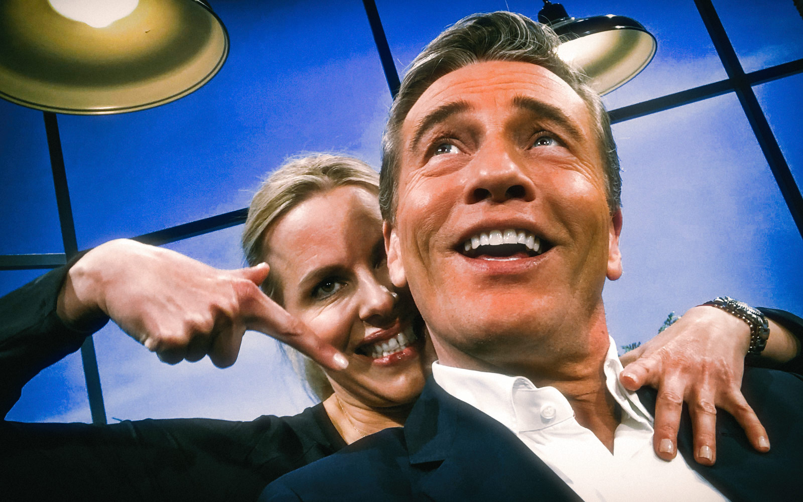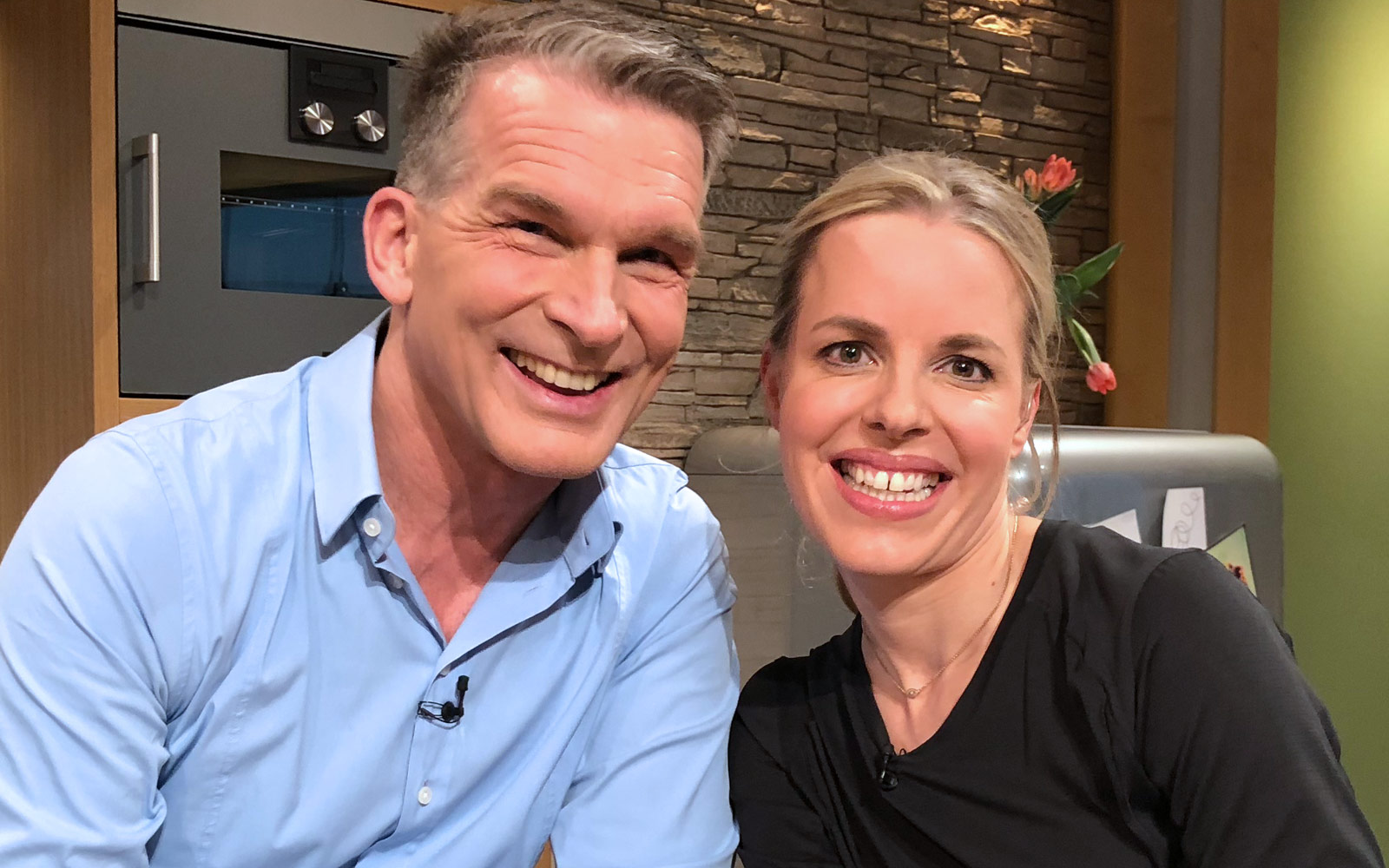 Stefan erscheint am 19. März 2018 im Wir-in-Bayern-Studio – allerdings ein wenig „overdressed“. Für die Übungen von Andrea Sixtus eignet sich der dunkelblaue Anzug mit Hosenträgern und weißem Hemd nur bedingt…;-) Egal, wir starten die Sendung um 16.15 Uhr gleich mal mit Hüpfen, Drehen und Dehnen! Und schon macht es „zoing!“ und ein Hosenträger löst sich mitten in der Übung! Hat aber zum Glück niemand gemerkt…