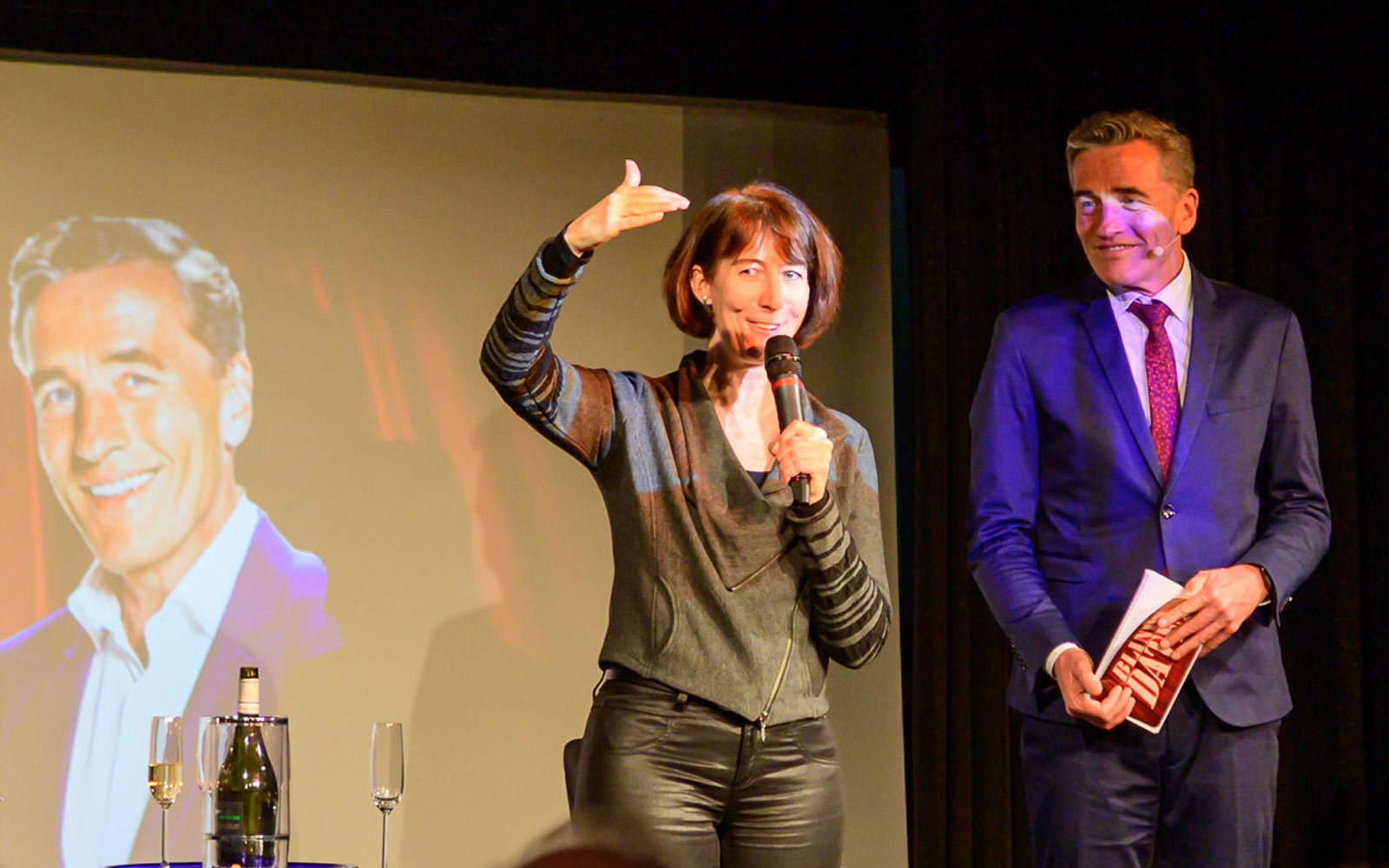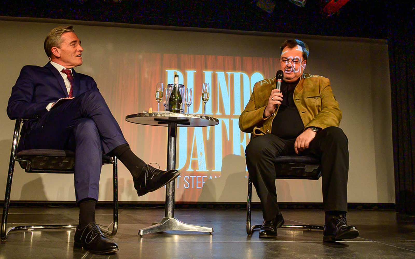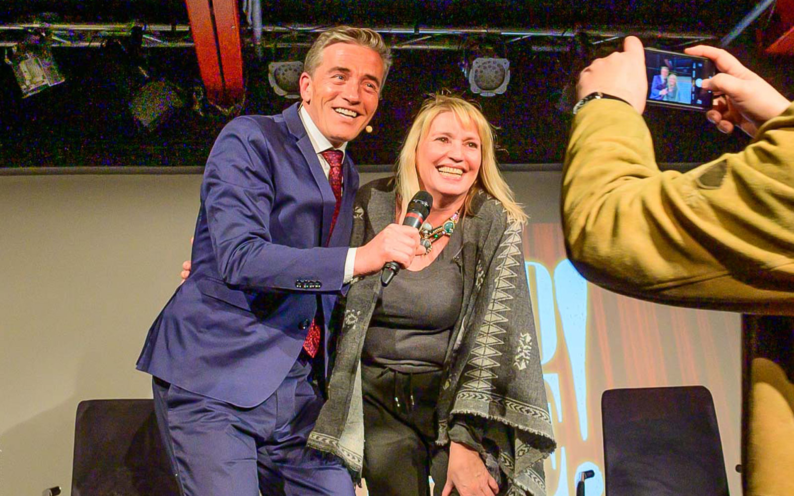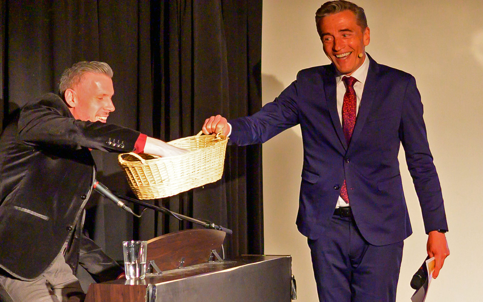 Funktioniert das? Kommt wer? Mögen die Menschen das? Alles Fragen, die in den Tagen zuvor ein wenig schlaflose Nächte bereitet haben…;-) Stefans Idee war eigentlich ganz einfach: Er moderiert einen Abend – und seine Talkgäste werden zufällig aus dem Publikum ausgewählt! Wer gezogen wird, darf (muss aber nicht) für eine Viertelstunde im Rampenlicht Platz nehmen. Mit Belohnung: Es gibt ein Selfie mit Stefan, ein Glas Sekt, ein Autogramm („Ob Sie wollen oder nicht!“). Und ein eigenes Lied, das der Impro-Musiker Florian Schwartz in nur einer Minute über den Gast komponiert und sogleich vorträgt! Dazu auch eine Expertin auf der Bühne: Coachin Rosi Konirsch, die Kommunikations-Tipps gibt. Wie beginne ich einen „Smalltalk“? Wie kommuniziere ich optisch gelungen nach außen? Wie umgehen mit Lampenfieber?