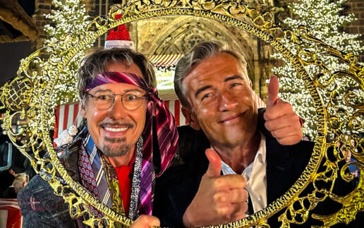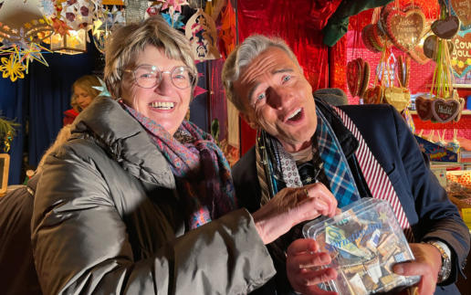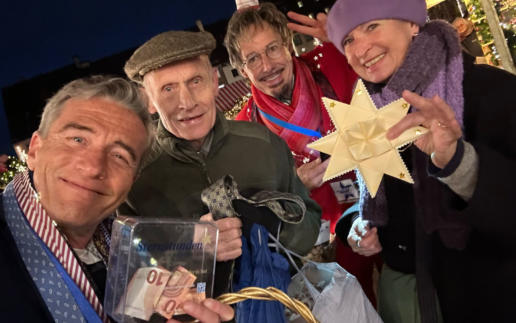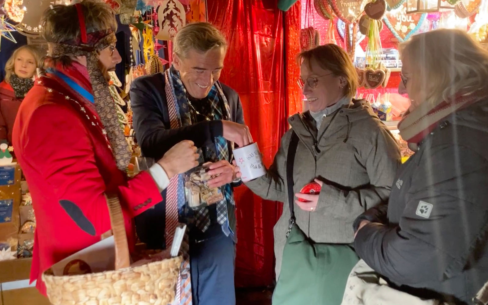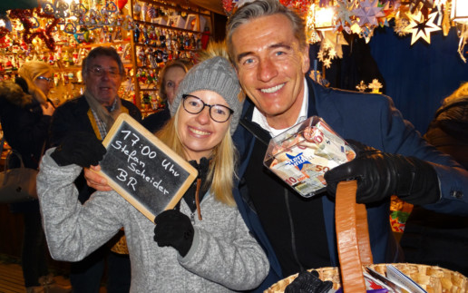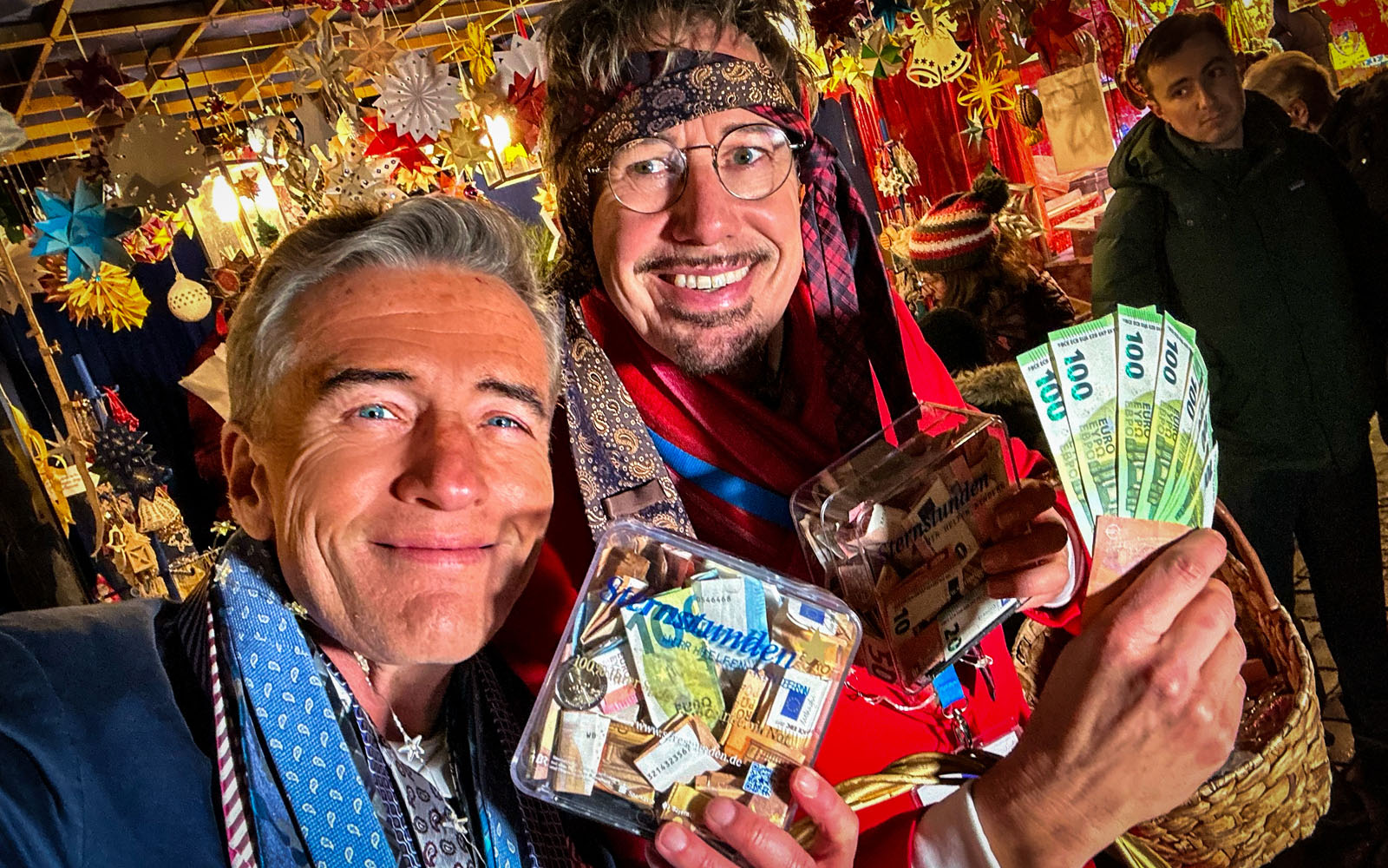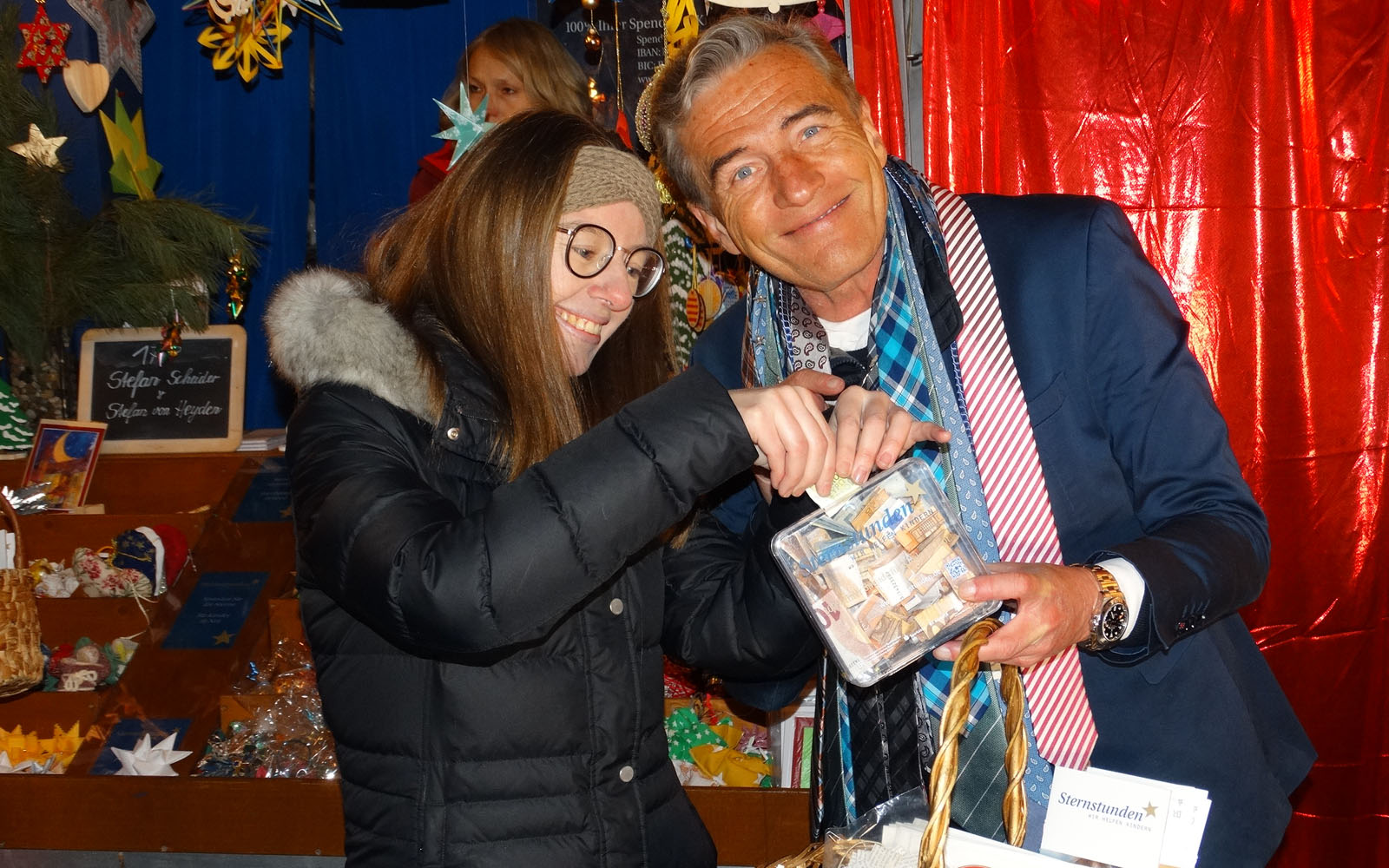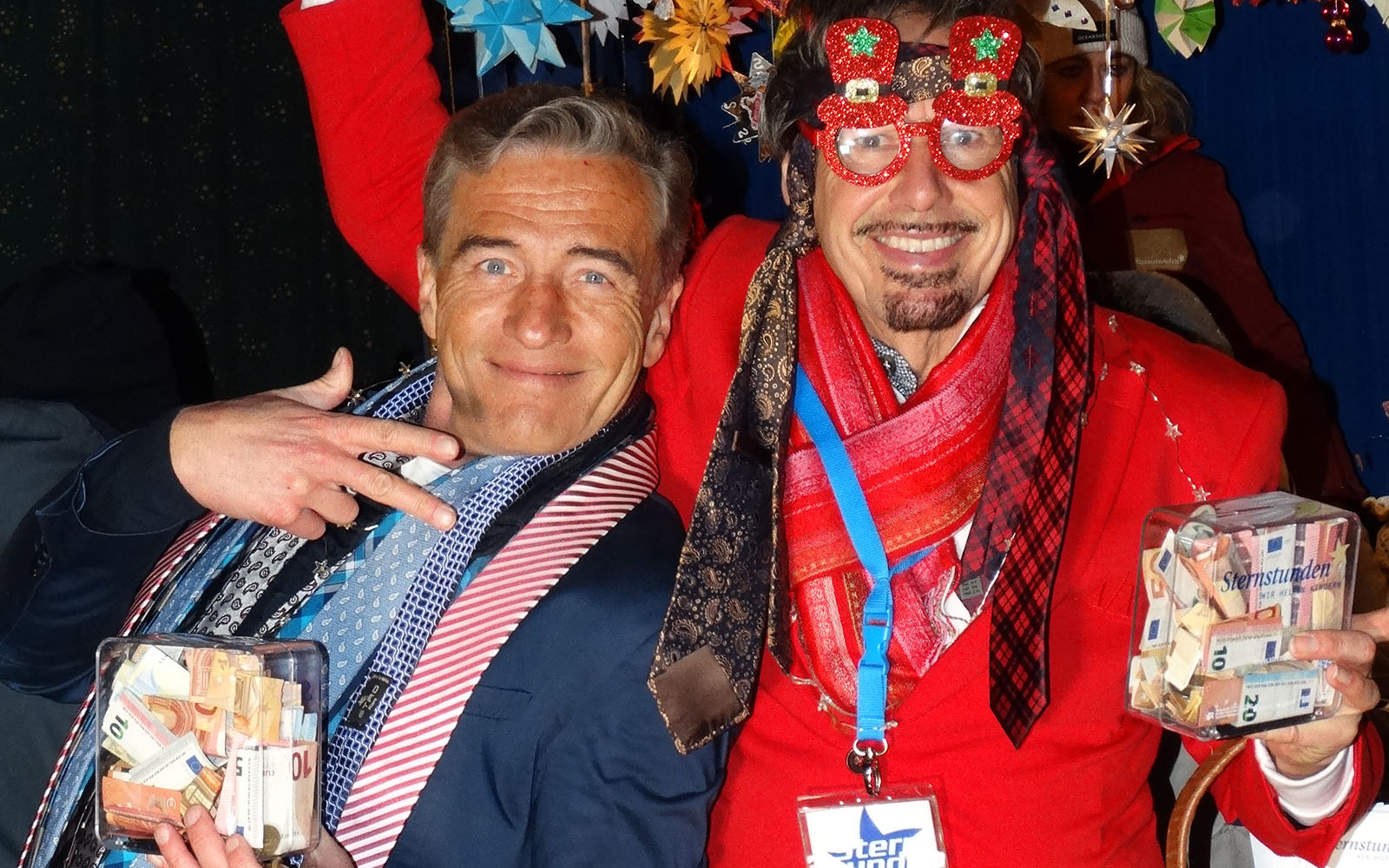 Schauspieler & Oldtimer-Freak Stefan von der Heyden und Moderator Stefan Scheider bringen die Stefan-Power an den Sternstunden-Stand: In nur einer Stunde von 17 bis 18 Uhr sammeln beide stolze 3700€ von wunderbaren Passanten und extra angereisten FreundInnen ein! Das Honorar? Ganz einfach: Zehn Rostbratwörschd gleich neben dem Christkindlesmarkt bei Bratwurst Röslein (Dankeschön, Thomas Förster!).