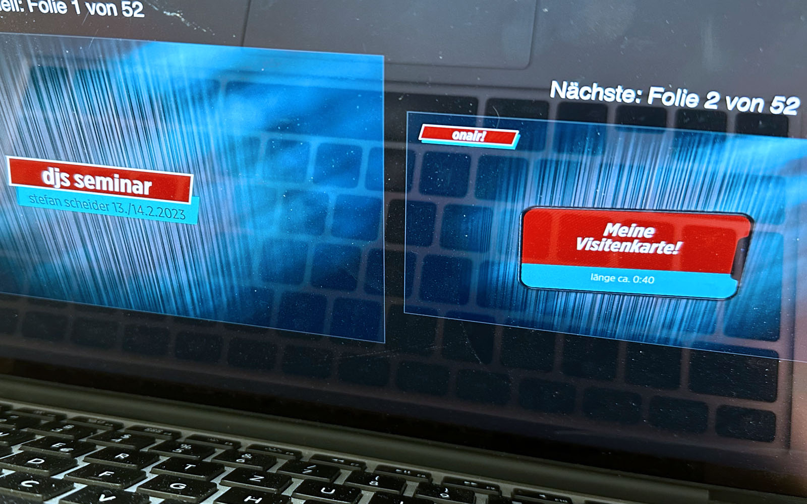 Nach einem Tag haben wir die Basics fürs Auftreten vor einer Kamera oder vor Publikum auf dem Radar. An Tag Zwei dann das „Masterpiece“: Die 60B soll am 14.2.2023 um Punkt 17 Uhr live auf Sendung gehen – und die ganze Welt schaut zu. Unser Thema dieses Mal: About us – also eine 20minütige Sendung über die Deutsche Journalistenschule und was man alles so lernt. Ach ja, Kamerakind Stefan hat die ganze Show mit seinem iPhone 14 Max Pro aufgenommen (plus Shure MV88 Mikrofon).