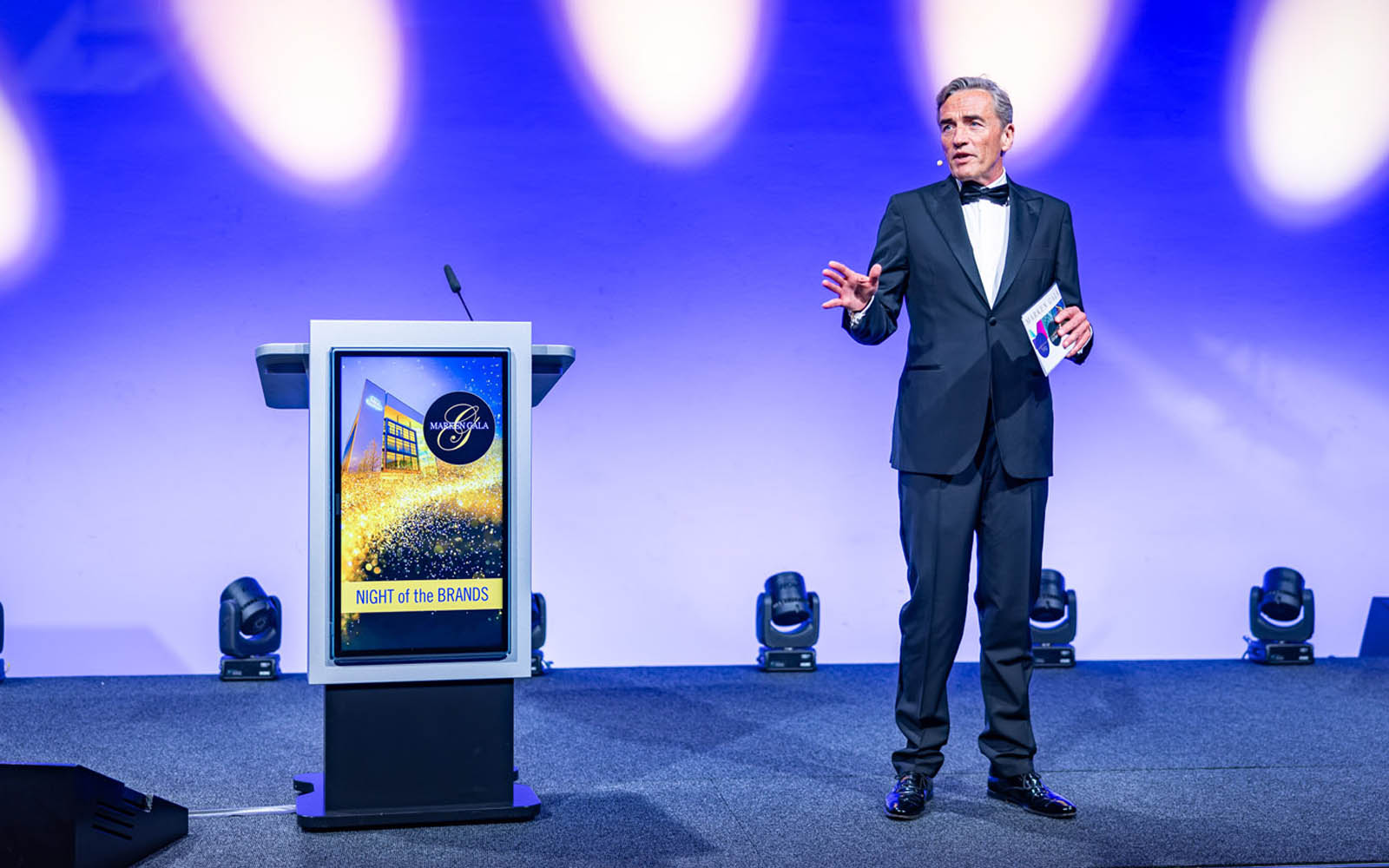„Moderator Stefan Scheider führte humorvoll durch die Gala und unterstrich die Bedeutung von Marken in unsicheren Zeiten, da sie Orientierung und Verlässlichkeit bieten.“
